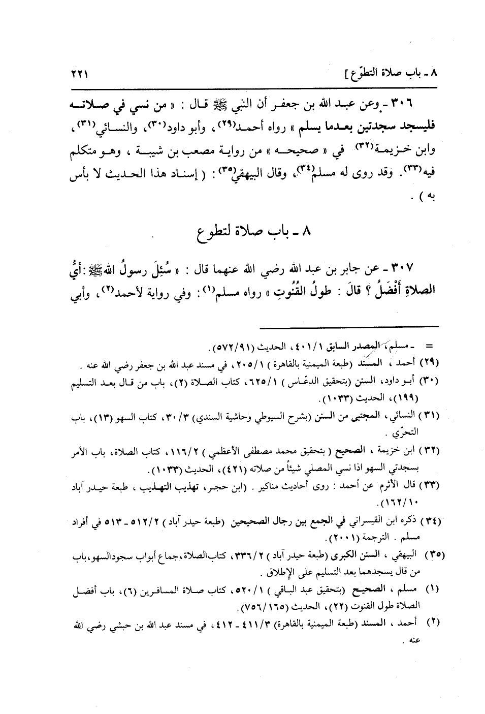 307 - عَن جَابر بن عبد الله رَضِيَ اللَّهُ عَنْهما قَالَ: " سُئِلَ رَسُول الله صَلَّى اللَّهُ عَلَيْهِ وَسَلَّم َ: أَي الصَّلَاة أفضل؟ قَالَ: طول الْقُنُوت " رَوَاهُ مُسلم: وَفِي رِوَايَة لِأَحْمَد، أبي