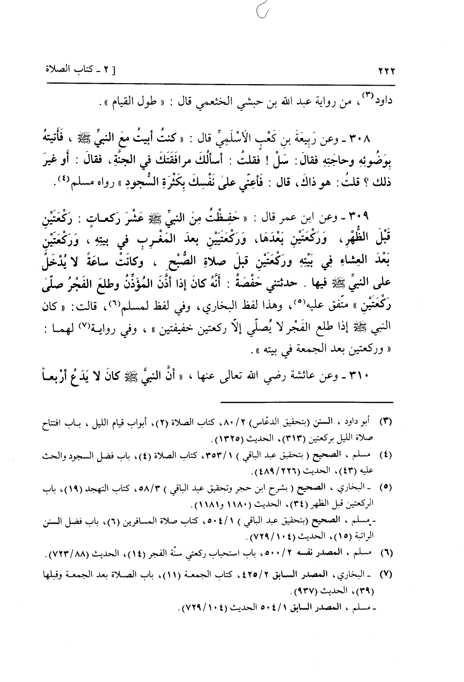 308 - وَعَن ربيعَة بن كَعْب الْأَسْلَمِيّ قَالَ: " كنت أَبيت مَعَ النَّبِي صَلَّى اللَّهُ عَلَيْهِ وَسَلَّم َ، فَأَتَيْته بوضوئه وَحَاجته فَقَالَ: سل! فَقلت: أَسأَلك مرافقتك فِي الْجنَّة، فَقَالَ: أَو غير ذَلِك؟ قلت: هُوَ ذَاك، قَالَ: فأعني عَلَى نَفسك بِكَثْرَة السُّجُود " رَوَاهُ مُسلم.