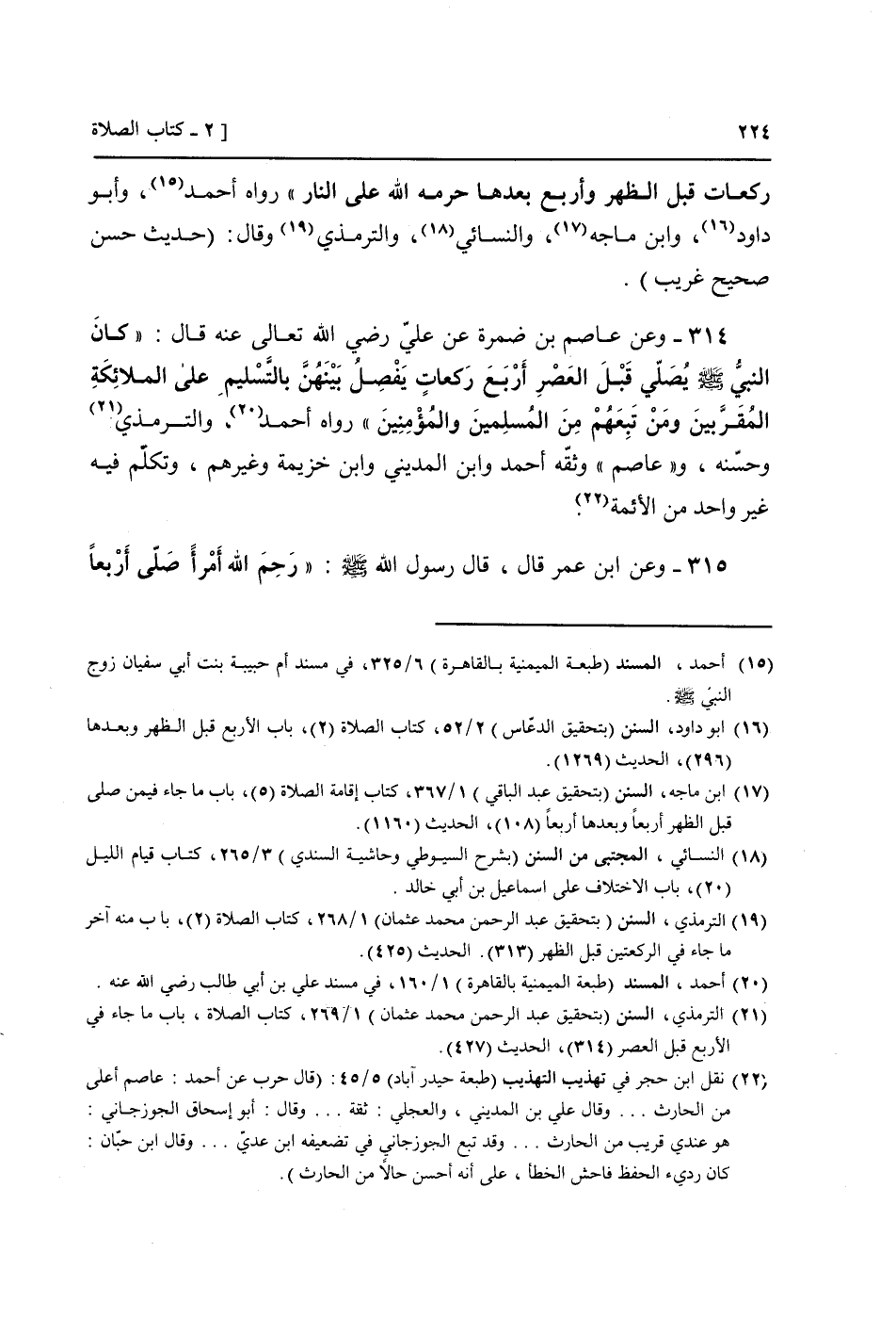 314 - وَعَن عَاصِم بن ضَمرَة عَن عَلّي رَضِي الله تَعَالَى عَنهُ قَالَ: " كَانَ النَّبِي صَلَّى اللَّهُ عَلَيْهِ وَسَلَّم َ يُصَلِّي قبل الْعَصْر أَربع رَكْعَات يفصل بَينهُنَّ بِالتَّسْلِيمِ عَلَى الْمَلَائِكَة المقربين وَمن تَبِعَهُمْ من الْمُسلمين وَالْمُؤمنِينَ " رَوَاهُ أَحْمد، (وَالتِّرْمِذِيّ وَحسنه، و " عَاصِم " وَثَّقَهُ أَحْمد وَابْن الْمَدِينِيّ وَابْن خُزَيْمَة وَغَيرهم، وَتكلم فِيهِ غير وَاحِد من الْأَئِمَّة) .