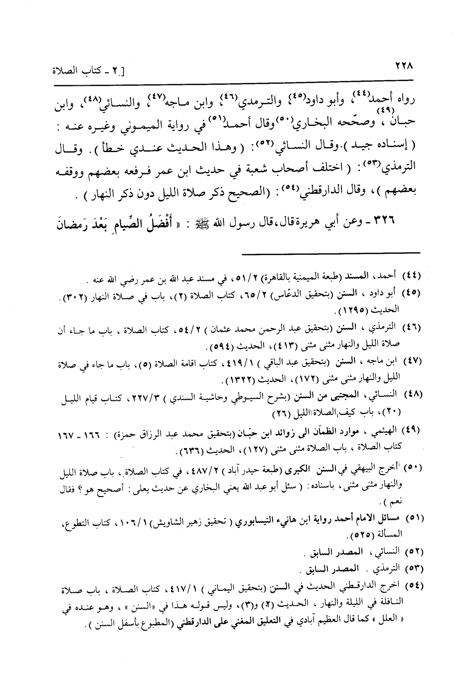 رَوَاهُ أَحْمد، وَأَبُو دَاوُد، وَالتِّرْمِذِيّ، وَابْن مَاجَه، وَالنَّسَائِيّ، وَابْن حبَان، (وَصَححهُ البُخَارِيّ وَقَالَ أَحْمد فِي رِوَايَة الْمَيْمُونِيّ وَغَيره عَنهُ: (إِسْنَاده جيد) . وَقَالَ النَّسَائِيّ: (وَهَذَا الحَدِيث عِنْدِي خطأ) . وَقَالَ التِّرْمِذِيّ: (اخْتلف أَصْحَاب شُعْبَة فِي حَدِيث ابْن عمر فرفعه بَعضهم وَوَقفه بَعضهم) ، وَقَالَ الدَّارَقُطْنِيّ: (الصَّحِيح ذكر صَلَاة اللَّيْل دون ذكر النَّهَار)) .