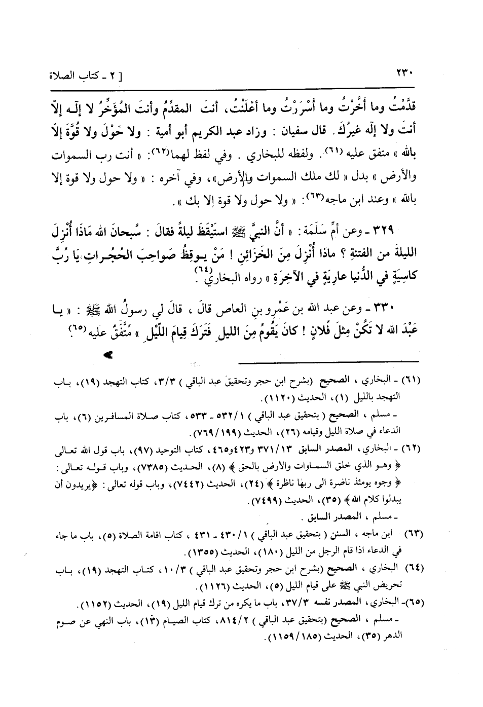 330 - وَعَن عبد الله بن عَمْرو بن الْعَاصِ قَالَ، قَالَ لي رَسُول الله صَلَّى اللَّهُ عَلَيْهِ وَسَلَّم َ: " يَا عبد الله لَا تكن مثل فلَان! كَانَ يقوم من اللَّيْل فَترك قيام اللَّيْل " مُتَّفق عَلَيْهِ.