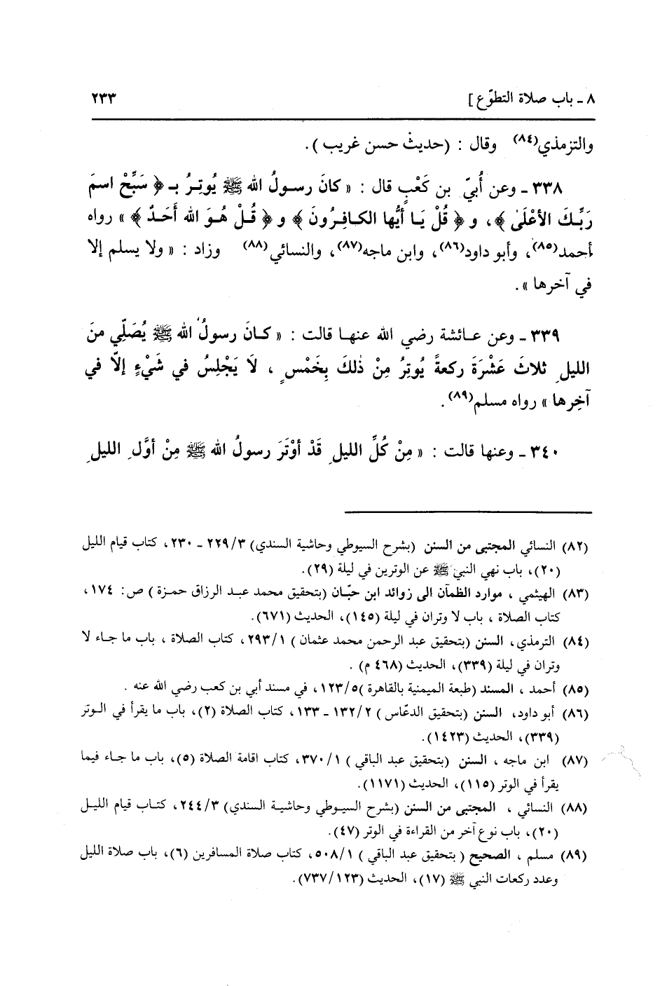 338 - وَعَن أبي بن كَعْب قَالَ: " كَانَ رَسُول الله صَلَّى اللَّهُ عَلَيْهِ وَسَلَّم َ يُوتر ب {سبح اسْم رَبك الْأَعْلَى} ، و {قل يَا أَيهَا الْكَافِرُونَ} و {قل هُوَ الله أحد} " رَوَاهُ أَحْمد، وَأَبُو دَاوُد، وَابْن ماجة، وَالنَّسَائِيّ وَزَاد: " وَلَا يسلم إِلَّا فِي آخرهَا ".
