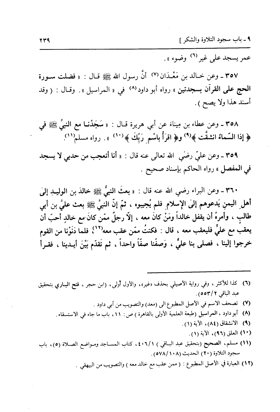 357 - وَعَن خَالِد بن معدان أَن رَسُول الله صَلَّى اللَّهُ عَلَيْهِ وَسَلَّم َ قَالَ: " فضلت سُورَة الْحَج عَلَى الْقُرْآن بسجدتين " (رَوَاهُ أَبُو دَاوُد فِي " الْمَرَاسِيل ". وَقَالَ: (وَقد أسْند هَذَا وَلَا يَصح)) .