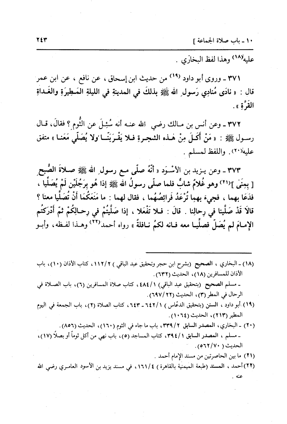 373 - وَعَن يزِيد بن الْأسود " أَنه صَلَّى مَعَ رَسُول الله صَلَّى اللَّهُ عَلَيْهِ وَسَلَّم َ صَلَاة الصُّبْح [بمنى] وَهُوَ غُلَام شَاب فَلَمَّا صَلَّى رَسُول الله صَلَّى اللَّهُ عَلَيْهِ وَسَلَّم َ إِذا هُوَ برجلَيْن لم يصليا، فَدَعَا بهما، فجيء بهما تُرْعَد فرائصهما، فَقَالَ لَهما: مَا منعكما أَن تصليا مَعنا؟ قَالَا قد صلينَا فِي رحالنا. قَالَ: فَلَا تفعلا، إِذا صليتم فِي رحالكُمْ ثمَّ أدركتم الإِمَام لم يصل فَصَليَا مَعَه فَإِنَّهُ لكم نَافِلَة " رَوَاهُ أَحْمد وَهَذَا لَفظه، وَأَبُو