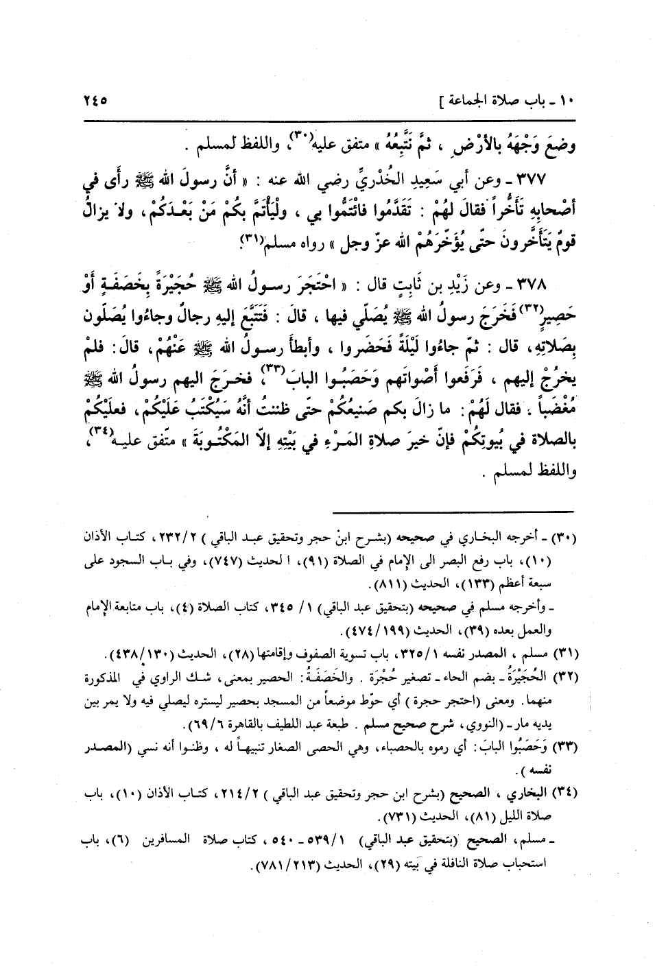 378 - وَعَن زيد بن ثَابت قَالَ: " احتجر رَسُول الله صَلَّى اللَّهُ عَلَيْهِ وَسَلَّم َ حجيرة بخصفة أَو حَصِير فَخرج رَسُول الله صَلَّى اللَّهُ عَلَيْهِ وَسَلَّم َ يُصَلِّي فِيهَا، قَالَ: فتتبع إِلَيْهِ رجال وَجَاءُوا يصلونَ بِصَلَاتِهِ، قَالَ: ثمَّ جَاءُوا لَيْلَة فَحَضَرُوا، وَأَبْطَأ رَسُول الله صَلَّى اللَّهُ عَلَيْهِ وَسَلَّم َ عَنْهُم، قَالَ: فَلم يخرج إِلَيْهِم، فَرفعُوا أَصْوَاتهم وحصبوا الْبَاب، فَخرج إِلَيْهِم رَسُول الله صَلَّى اللَّهُ عَلَيْهِ وَسَلَّم َ مغضبا، فَقَالَ لَهُم: مَا زَالَ بكم صنيعكم حَتَّى ظَنَنْت أَنه سيكتب عَلَيْكُم، فَعَلَيْكُم بِالصَّلَاةِ فِي بُيُوتكُمْ فَإِن خير صَلَاة الْمَرْء فِي بَيته إِلَّا الْمَكْتُوبَة " مُتَّفق عَلَيْهِ، وَاللَّفْظ لمُسلم.