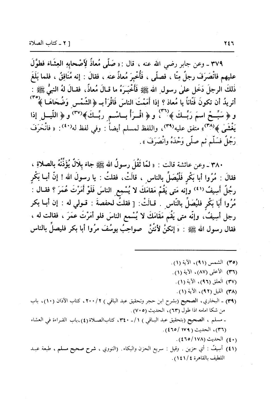 379 - وَعَن جَابر رَضِيَ اللَّهُ عَنْه، قَالَ: " صَلَّى معَاذ لأَصْحَابه الْعشَاء فطول عَلَيْهِم فَانْصَرف رجل منا، فَصَلى، فَأخْبر معَاذ عَنهُ، فَقَالَ: إِنَّه مُنَافِق، فَلَمَّا بلغ ذَلِك الرجل دخل عَلَى رَسُول الله صَلَّى اللَّهُ عَلَيْهِ وَسَلَّم َ فَأخْبرهُ مَا قَالَ معَاذ، فَقَالَ لَهُ النَّبِي صَلَّى اللَّهُ عَلَيْهِ وَسَلَّم َ: أَتُرِيدُ أَن تكون فتانا يَا معَاذ؟ إِذا أممت النَّاس فاقرأ ب {الشَّمْس وَضُحَاهَا} و {سبح اسْم رَبك} ، و {اقْرَأ باسم رَبك} و {اللَّيْل إِذا يغشى} " مُتَّفق عَلَيْهِ، وَاللَّفْظ لمُسلم أَيْضا: وَفِي لفظ لَهُ: " فانحرف رجل فَسلم ثمَّ صَلَّى وَحده وَانْصَرف ".