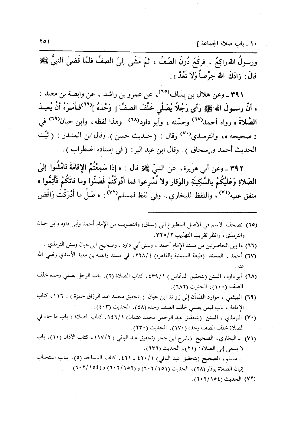 391 - وَعَن هِلَال بن يسَاف، عَن عَمْرو بن رَاشد، عَن وابصة بن معبد: " أَن رَسُول الله صَلَّى اللَّهُ عَلَيْهِ وَسَلَّم َ رَأَى رجلا يُصَلِّي خلف الصَّفّ [وَحده] فَأمره أَن يُعِيد الصَّلَاة " رَوَاهُ أَحْمد وَحسنه، وَأَبُو دَاوُد وَهَذَا لَفظه، وَابْن حبَان فِي " صَحِيحه "، (وَالتِّرْمِذِيّ وَقَالَ: (حَدِيث حسن) . وَقَالَ ابْن الْمُنْذر: (ثبّت الحَدِيث أَحْمد وَإِسْحَاق) . وَقَالَ ابْن عبد الْبر: (فِي إِسْنَاده اضْطِرَاب)) .