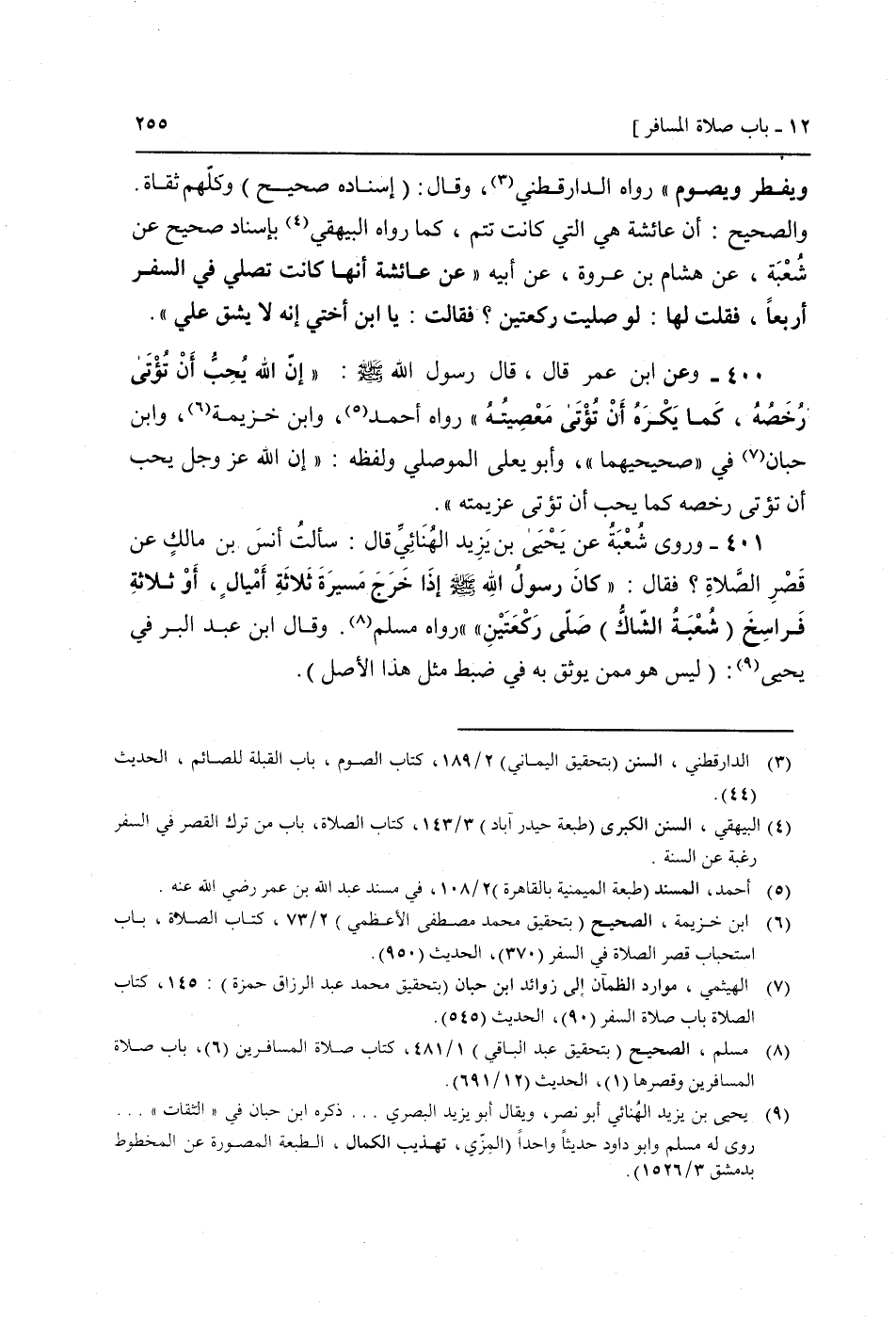 401 - وَرَوَى شُعْبَة عَن يَحْيَى بن يزِيد الْهنائِي قَالَ: سَأَلت أنس بن مَالك عَن قصر الصَّلَاة؟ فَقَالَ: " كَانَ رَسُول الله صَلَّى اللَّهُ عَلَيْهِ وَسَلَّم َ إِذا خرج مسيرَة ثَلَاثَة أَمْيَال، أَو ثَلَاثَة فراسخ (شُعْبَة الشاك) صَلَّى رَكْعَتَيْنِ " رَوَاهُ مُسلم. (وَقَالَ ابْن عبد الْبر فِي يَحْيَى: (لَيْسَ هُوَ مِمَّن يوثق بِهِ فِي ضبط مثل هَذَا الأَصْل)) .
