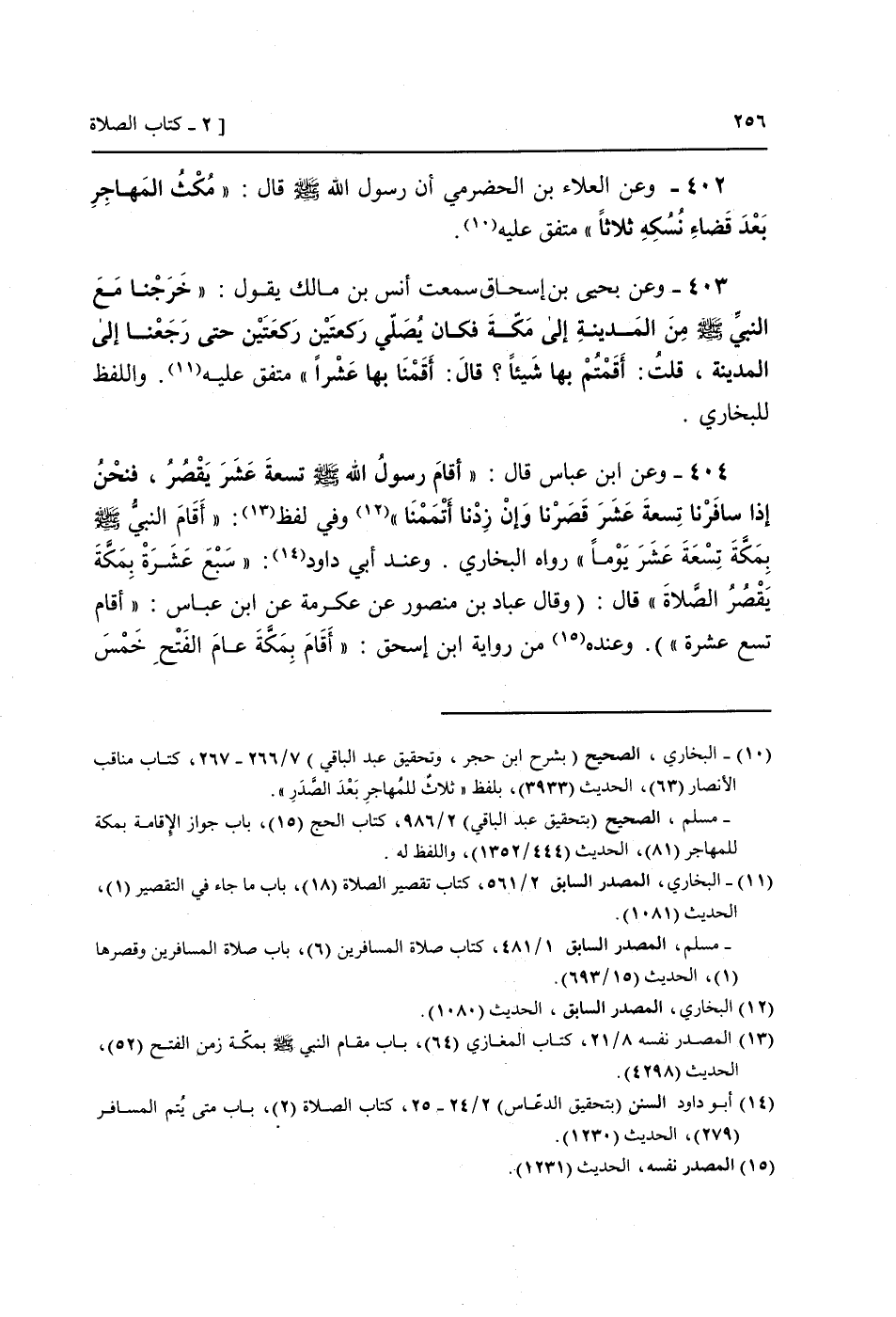 404 - وَعَن ابْن عَبَّاس قَالَ: " أَقَامَ رَسُول الله صَلَّى اللَّهُ عَلَيْهِ وَسَلَّم َ تِسْعَة عشر يقصر، فَنحْن إِذا سافرنا تِسْعَة عشر قَصرنَا وَإِن زِدْنَا أتممنا " وَفِي لفظ: " أَقَامَ النَّبِي صَلَّى اللَّهُ عَلَيْهِ وَسَلَّم َ بِمَكَّة تِسْعَة عشر يَوْمًا " رَوَاهُ البُخَارِيّ. وَعند أبي دَاوُد: " سبع عشرَة بِمَكَّة يقصر الصَّلَاة " قَالَ: (وَقَالَ عباد بن مَنْصُور عَن عِكْرِمَة عَن ابْن عَبَّاس: " أَقَامَ تسع عشرَة ") . وَعِنْده من رِوَايَة ابْن إِسْحَق: " أَقَامَ بِمَكَّة عَام الْفَتْح خمس