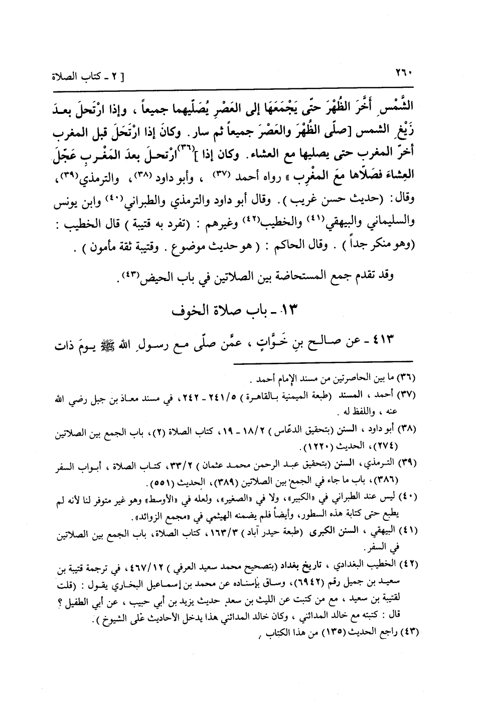 الشَّمْس أخر الظّهْر حَتَّى يجمعها إِلَى الْعَصْر يُصَلِّيهمَا جَمِيعًا، وَإِذا ارتحل بعد زيغ الشَّمْس [صَلَّى الظّهْر وَالْعصر جَمِيعًا ثمَّ سَار. وَكَانَ إِذا ارتحل قبل الْمغرب أخر الْمغرب حَتَّى يُصليهَا مَعَ الْعشَاء. وَكَانَ إِذا] ارتحل بعد الْمغرب عجل الْعشَاء فَصلاهَا مَعَ الْمغرب " رَوَاهُ أَحْمد، وَأَبُو دَاوُد، وَالتِّرْمِذِيّ، (وَقَالَ: (حَدِيث حسن غَرِيب) . وَقَالَ أَبُو دَاوُد وَالتِّرْمِذِيّ وَالطَّبَرَانِيّ وَابْن يُونُس والسليماني وَالْبَيْهَقِيّ والخطيب وَغَيرهم: (تفرد بِهِ قُتَيْبَة) قَالَ الْخَطِيب (وَهُوَ مُنكر جدا) . وَقَالَ الْحَاكِم: (هُوَ حَدِيث مَوْضُوع. وقتيبة ثِقَة مَأْمُون)) . وَقد تقدم جمع الْمُسْتَحَاضَة بَين الصَّلَاتَيْنِ فِي بَاب الْحيض.