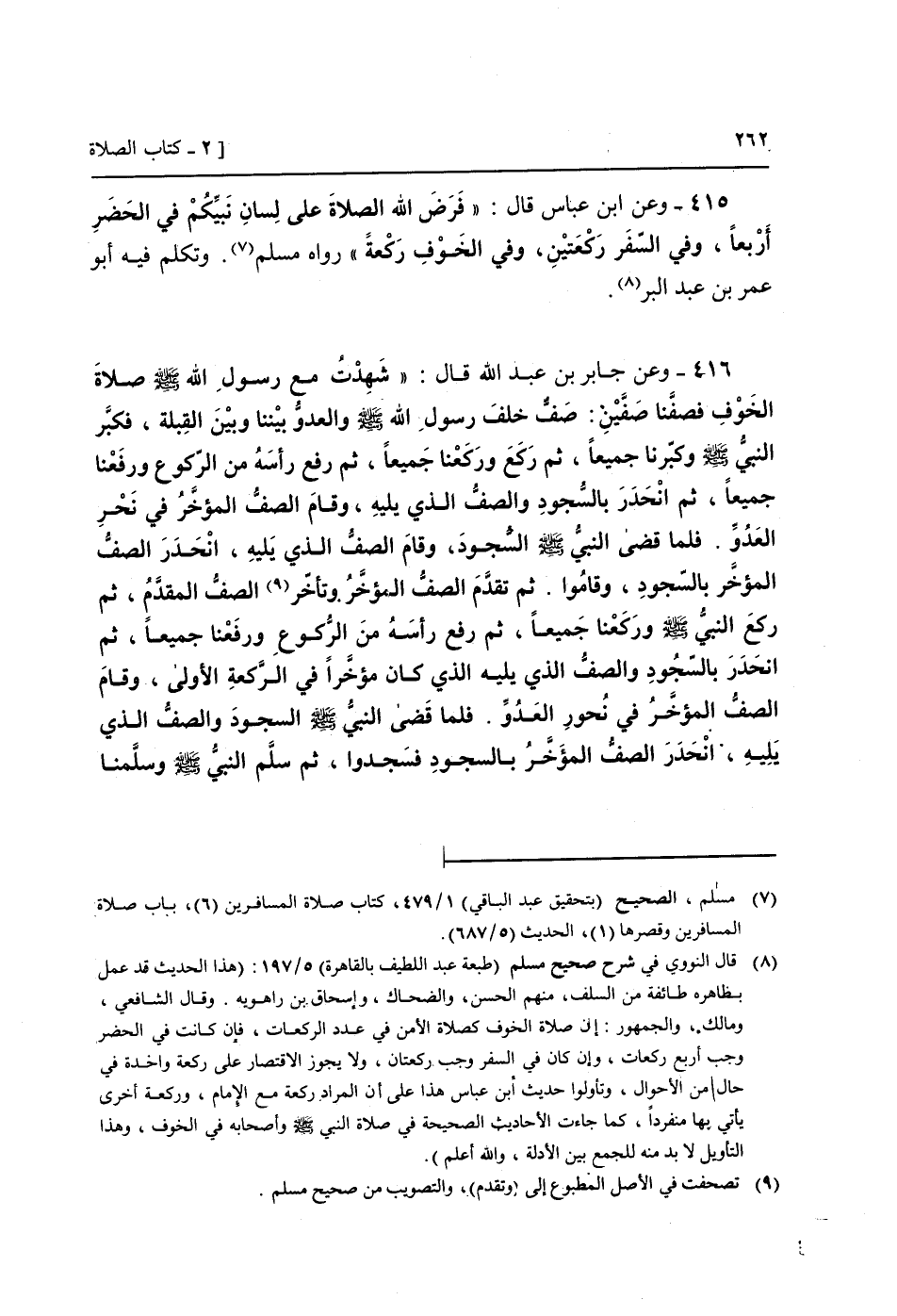 415 - وَعَن ابْن عَبَّاس قَالَ: " فرض الله الصَّلَاة عَلَى لِسَان نَبِيكُم فِي الْحَضَر أَرْبعا، وَفِي السّفر رَكْعَتَيْنِ، وَفِي الْخَوْف رَكْعَة " رَوَاهُ مُسلم. وَتكلم فِيهِ أَبُو عمر بن عبد الْبر.