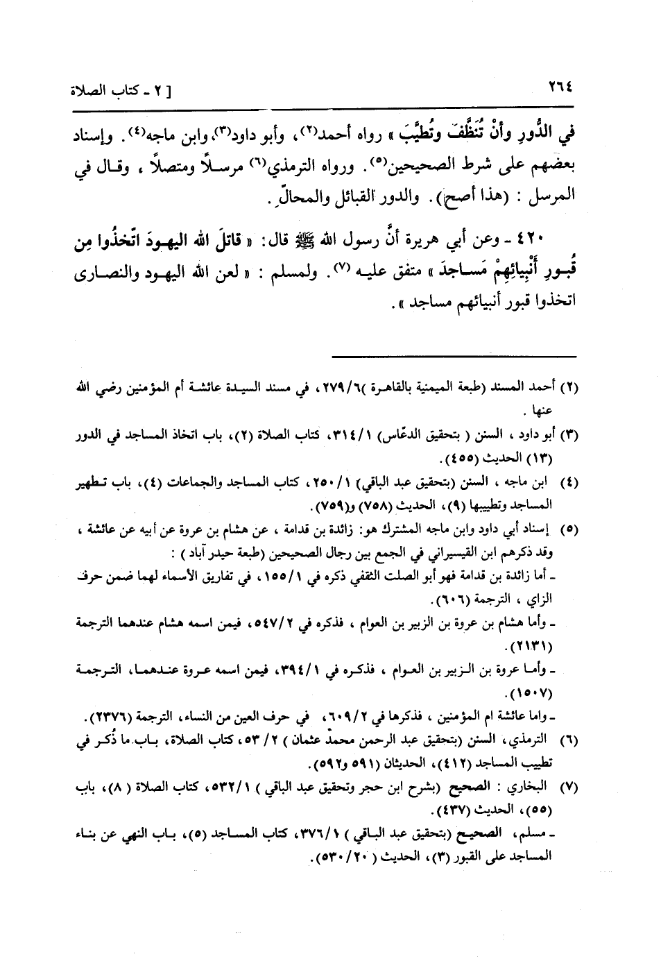 420 - وَعَن أبي هُرَيْرَة أَن رَسُول الله صَلَّى اللَّهُ عَلَيْهِ وَسَلَّم َ قَالَ: " قَاتل الله الْيَهُود اتَّخذُوا من قُبُور أَنْبِيَائهمْ مَسَاجِد " مُتَّفق عَلَيْهِ. وَلمُسلم: " لعن الله الْيَهُود وَالنَّصَارَى اتَّخذُوا قُبُور أَنْبِيَائهمْ مَسَاجِد ".