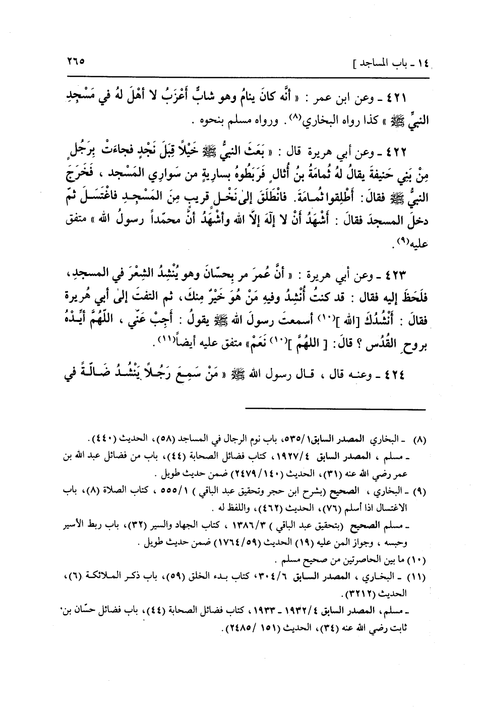 423 - وَعَن أبي هُرَيْرَة: " أَن عمر مر بِحسان وَهُوَ ينشد الشّعْر فِي الْمَسْجِد، فلحظ إِلَيْهِ فَقَالَ: قد كنت أنْشد وَفِيه من هُوَ خير مِنْك، ثمَّ الْتفت إِلَى أبي هُرَيْرَة فَقَالَ: أنْشدك [الله] أسمعت رَسُول الله صَلَّى اللَّهُ عَلَيْهِ وَسَلَّم َ يَقُول: أجب عني، اللَّهُمَّ أيده بِروح الْقُدس؟ قَالَ: [اللَّهُمَّ] نعم " مُتَّفق عَلَيْهِ أَيْضا.