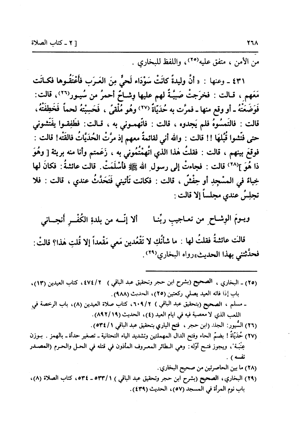 431 - وعنها: " أَن وليدة كَانَت سَوْدَاء لحي من الْعَرَب فأعتقوها فَكَانَت مَعَهم، قَالَت: فَخرجت صبية لَهُم عَلَيْهَا وشاح أَحْمَر من سيور، قَالَت: فَوَضَعته - أَو وَقع مِنْهَا - فمرت بِهِ حدياة وَهُوَ ملقى، فحسبته لَحْمًا فخطفته، قَالَت: فالتمسوه فَلم يجدوه، قَالَت: فاتهموني بِهِ، قَالَت: فطفقوا يفتشوني حَتَّى فتشوا قبلهَا! ! قَالَت: وَالله أَنِّي لقائمة مَعَهم إِذْ مرت الحديات فألقته! قَالَت: فَوَقع بَينهم، قَالَت: فَقلت هَذَا الَّذِي اتهمتموني بِهِ، زعمتم وَأَنا مِنْهُ بريئة [وَهُوَ ذَا هُوَ] قَالَت: فَجَاءَت إِلَى رَسُول الله صَلَّى اللَّهُ عَلَيْهِ وَسَلَّم َ فَأسْلمت. قَالَت عَائِشَة: فَكَانَ لَهَا خباء فِي الْمَسْجِد أَو حفش، قَالَت: فَكَانَت تَأتِينِي فَتحدث عِنْدِي، قَالَت: فَلَا تجْلِس عِنْدِي مَجْلِسا إِلَّا قَالَت: