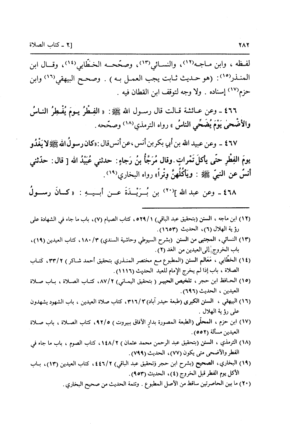 467 - وَعَن عبيد الله بن أبي بكر بن أنس، عَن أنس قَالَ: " كَانَ رَسُول الله صَلَّى اللَّهُ عَلَيْهِ وَسَلَّم َ لَا يَغْدُو يَوْم الْفطر حَتَّى يَأْكُل تمرات. وَقَالَ مرجأ بن رَجَاء: حَدثنِي عبيد الله [قَالَ: حَدثنِي أنس عَن النَّبِي صَلَّى اللَّهُ عَلَيْهِ وَسَلَّم َ: ويأكلهن وترا " رَوَاهُ البُخَارِيّ.