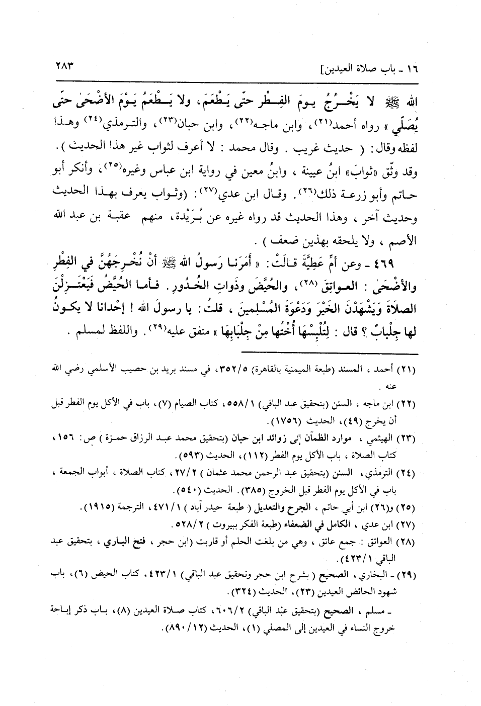 الله صَلَّى اللَّهُ عَلَيْهِ وَسَلَّم َ لَا يخرج يَوْم الْفطر حَتَّى يطعم، وَلَا يطعم يَوْم الْأَضْحَى حَتَّى يُصَلِّي " رَوَاهُ أَحْمد، وَابْن مَاجَه، وَابْن حبَان، وَالتِّرْمِذِيّ وَهَذَا لَفظه (وَقَالَ: (حَدِيث غَرِيب. وَقَالَ مُحَمَّد: لَا أعرف لثواب غير هَذَا الحَدِيث) . وَقد وثق " ثَوَاب " ابْن عُيَيْنَة، وَابْن معِين فِي رِوَايَة ابْن عَبَّاس وَغَيره، وَأنكر أَبُو حَاتِم وَأَبُو زرْعَة ذَلِك. وَقَالَ ابْن عدي: (وثواب يعرف بِهَذَا الحَدِيث وَحَدِيث آخر، وَهَذَا الحَدِيث قد رَوَاهُ غَيره عَن بُرَيْدَة، مِنْهُم عقبَة بن عبد الله الْأَصَم، وَلَا يلْحقهُ بِهَذَيْنِ ضعف)) .