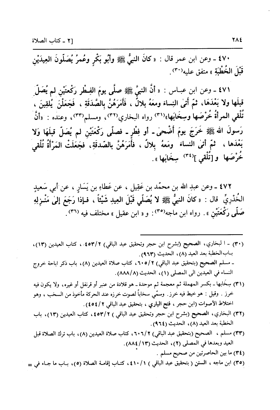471 - وَعَن ابْن عَبَّاس: " أَن النَّبِي صَلَّى اللَّهُ عَلَيْهِ وَسَلَّم َ صَلَّى يَوْم الْفطر رَكْعَتَيْنِ لم يصل قبلهَا وَلَا بعْدهَا، ثمَّ أَتَى النِّسَاء وَمَعَهُ بِلَال، فأمرهن بِالصَّدَقَةِ، فَجعلْنَ يلقين، تلقي الْمَرْأَة خرصها وسخابها " رَوَاهُ البُخَارِيّ، وَمُسلم، وَعِنْده: " أَن رَسُول الله صَلَّى اللَّهُ عَلَيْهِ وَسَلَّم َ خرج يَوْم أَضْحَى - أَو فطر - فَصَلى رَكْعَتَيْنِ لم يصل قبلهَا وَلَا بعْدهَا، ثمَّ أَتَى النِّسَاء وَمَعَهُ بِلَال، فأمرهن بِالصَّدَقَةِ، فَجعلت الْمَرْأَة تلقي خرصها و [تلقي] سخابها ".