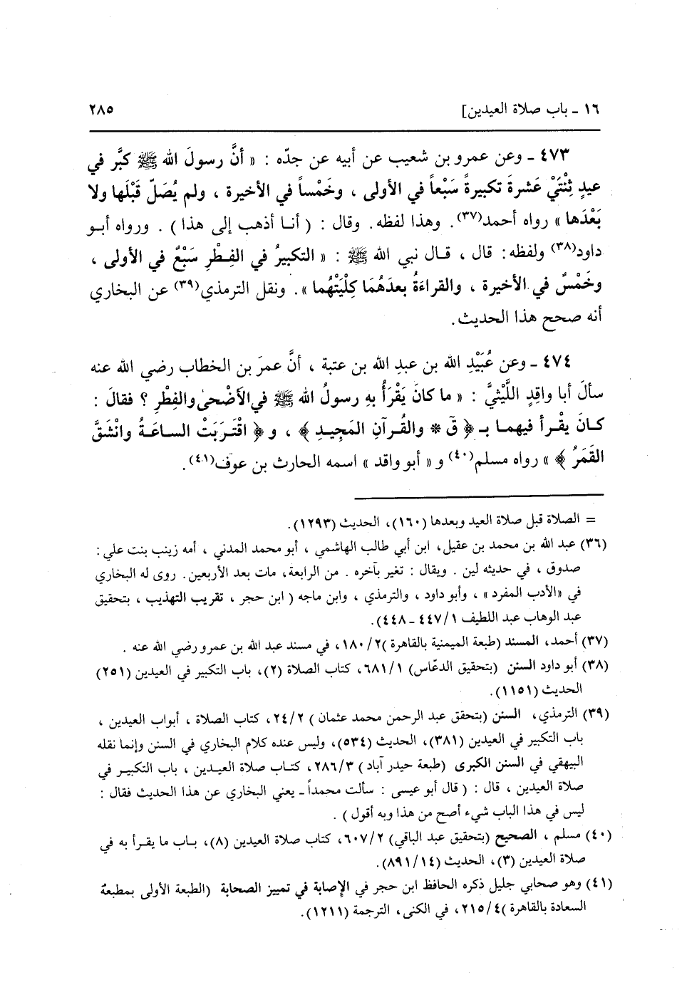 473 - وَعَن عَمْرو بن شُعَيْب عَن أَبِيه عَن جده: " أَن رَسُول الله صَلَّى اللَّهُ عَلَيْهِ وَسَلَّم َ كبّر فِي عيد ثِنْتَيْ عشرَة تَكْبِيرَة سبعا فِي الأولَى، وخمسا فِي الْأَخِيرَة، وَلم يصل قبلهَا وَلَا بعْدهَا " رَوَاهُ أَحْمد. وَهَذَا لَفظه. وَقَالَ: (أَنا أذهب إِلَى هَذَا) . وَرَوَاهُ أَبُو دَاوُد وَلَفظه: قَالَ، قَالَ نَبِي الله صَلَّى اللَّهُ عَلَيْهِ وَسَلَّم َ: " التَّكْبِير فِي الْفطر سبع فِي الأولَى، وَخمْس فِي الْأَخِيرَة، وَالْقِرَاءَة بعدهمَا كليتهما ". (وَنقل التِّرْمِذِيّ عَن البُخَارِيّ أَنه صحّح هَذَا الحَدِيث) .