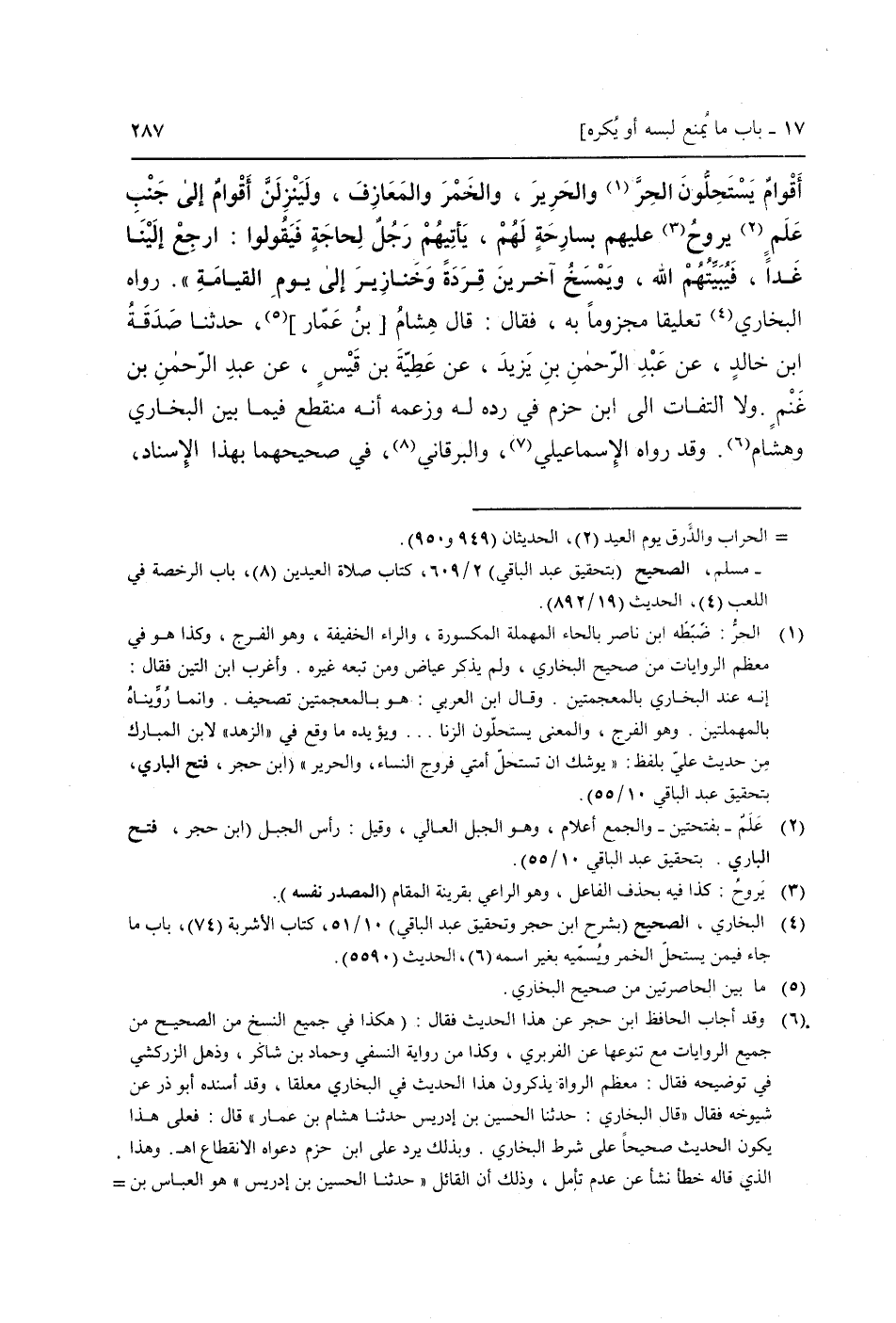 أَقوام يسْتَحلُّونَ الْحر وَالْحَرِير، وَالْخمر وَالْمَعَازِف، ولينزلن أَقوام إِلَى جنب علم يروح عَلَيْهِم بسارحة لَهُم، يَأْتِيهم رجل لحَاجَة فيقولوا: ارْجع إِلَيْنَا غَدا، فيبيتهم الله، وَيمْسَح آخَرين قردة وَخَنَازِير إِلَى يَوْم الْقِيَامَة ". (رَوَاهُ البُخَارِيّ تَعْلِيقا مَجْزُومًا بِهِ) ، فَقَالَ: قَالَ هِشَام [بن عمار] ، حَدثنَا صَدَقَة ابْن خَالِد، عَن عبد الرَّحْمَن بن يزِيد، عَن عَطِيَّة بن قيس، عَن عبد الرَّحْمَن بن غنم. وَلَا الْتِفَات إِلَى ابْن حزم فِي رده لَهُ وزعمه أَنه مُنْقَطع فِيمَا بَين البُخَارِيّ وَهِشَام. (وَقد رَوَاهُ الْإِسْمَاعِيلِيّ، وَالْبرْقَانِي، فِي صَحِيحهمَا بِهَذَا الْإِسْنَاد) ،