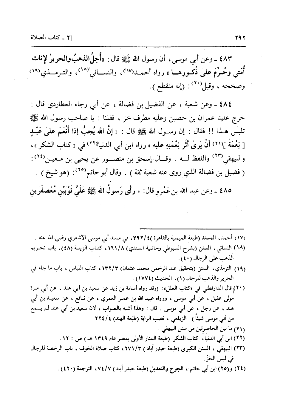 484 - وَعَن شُعْبَة، عَن الفضيل بن فضَالة، عَن أبي رَجَاء العطاردي قَالَ: خرج علينا عمرَان بن حُصَيْن وَعَلِيهِ مطرف خَز، فَقُلْنَا: يَا صَاحب رَسُول الله صَلَّى اللَّهُ عَلَيْهِ وَسَلَّم َ تلبس هَذَا! ! فَقَالَ: إِن رَسُول الله صَلَّى اللَّهُ عَلَيْهِ وَسَلَّم َ قَالَ: " إِن الله يحب إِذا أنعم عَلَى عبد [نعْمَة] أَن يرَى أثر نعْمَته عَلَيْهِ " رَوَاهُ ابْن أبي الدُّنْيَا فِي " كتاب الشُّكْر "، وَالْبَيْهَقِيّ وَاللَّفْظ لَهُ. (وَقَالَ إِسْحَق بن مَنْصُور عَن يَحْيَى بن معِين: (فُضَيْل بن فضَالة الَّذِي رَوَى عَنهُ شُعْبَة ثِقَة) . وَقَالَ أَبُو حَاتِم: (هُوَ شيخ)) .
