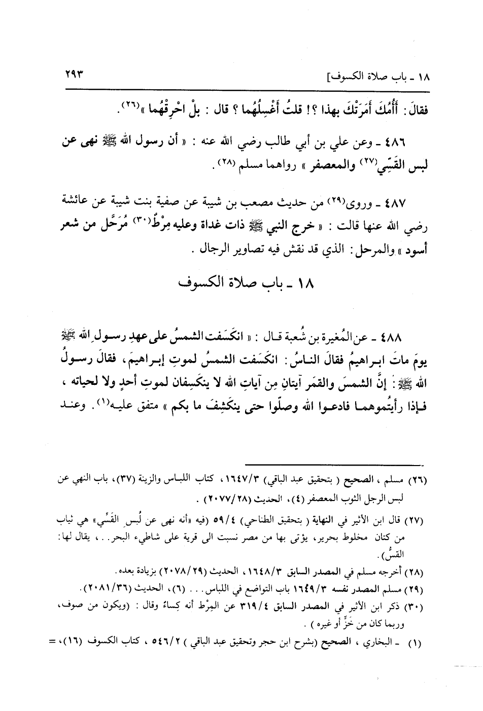 486 - وَعَن عَلّي بن أبي طَالب رَضِيَ اللَّهُ عَنْه: " أَن رَسُول الله صَلَّى اللَّهُ عَلَيْهِ وَسَلَّم َ نهَى عَن لبس القسي والمعصفر " رَوَاهُمَا مُسلم.