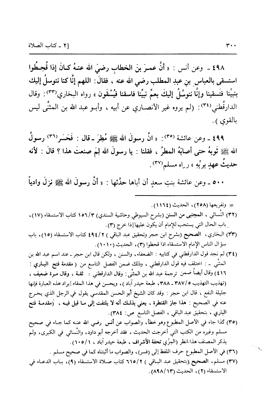 498 - وَعَن أنس: " أَن عمر بن الْخطاب رَضِيَ اللَّهُ عَنْه كَانَ إِذا قُحطوا استسقى بِالْعَبَّاسِ بن عبد الْمطلب رَضِيَ اللَّهُ عَنْه، فَقَالَ: اللَّهُمَّ إِنَّا كُنَّا نتوسل إِلَيْك بنبينا فتسقينا وَإِنَّا نتوسل إِلَيْك بعم نَبينَا فاسقنا فيسقون " رَوَاهُ البُخَارِيّ: وَقَالَ (الدَّارَقُطْنِيّ: (لم يروه غير الْأنْصَارِيّ عَن أَبِيه، وَأَبُو عبد الله بن الْمثنى لَيْسَ بِالْقَوِيّ)) .