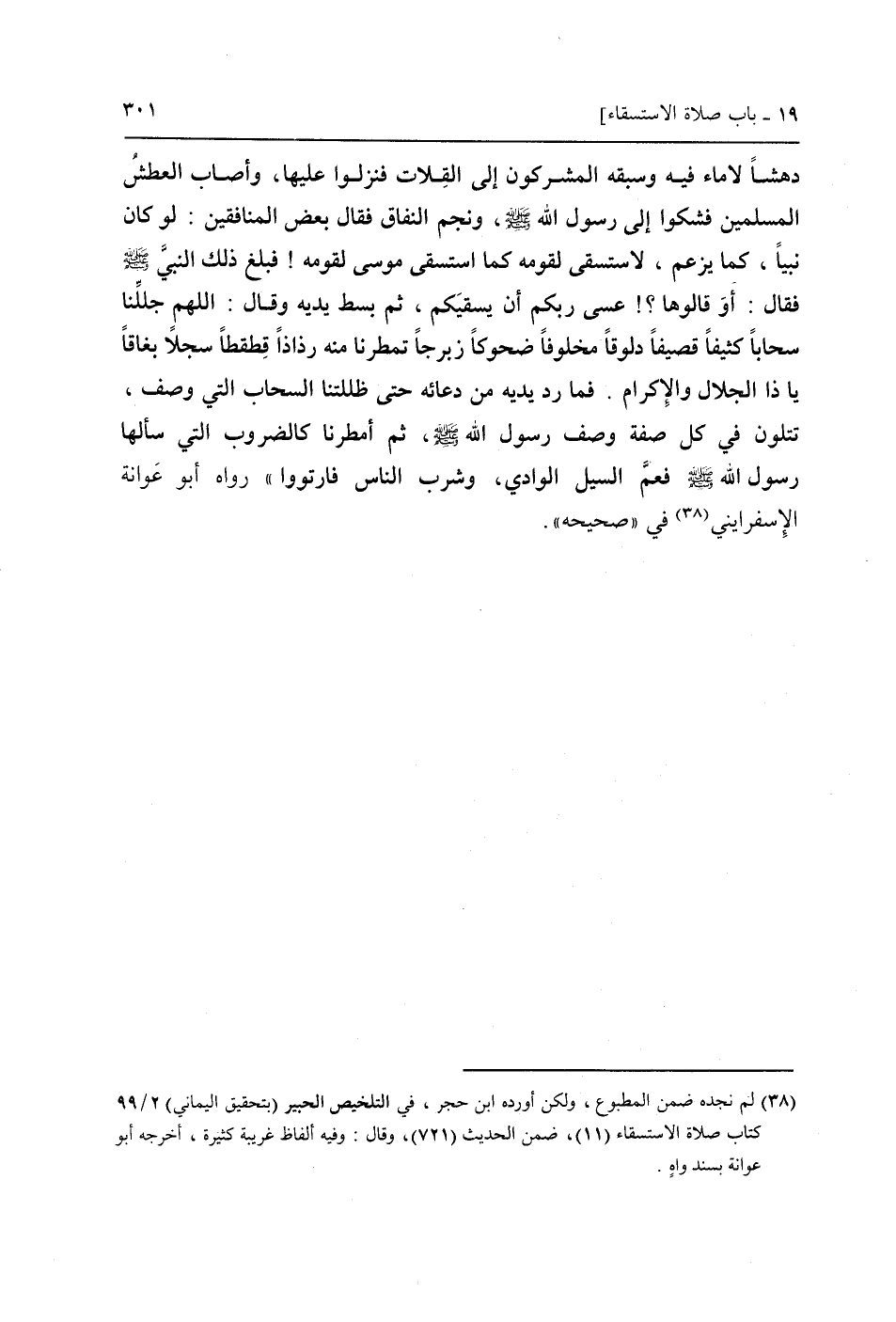 دهشاً لَا مَاء فِيهِ وَسَبقه الْمُشْركُونَ إِلَى القلات فنزلوا عَلَيْهَا، وَأصَاب الْعَطش الْمُسلمين فشكوا إِلَى رَسُول الله صَلَّى اللَّهُ عَلَيْهِ وَسَلَّم َ، وَنجم النِّفَاق فَقَالَ بعض الْمُنَافِقين: لَو كَانَ نَبيا، كَمَا يزْعم، لاستسقى لِقَوْمِهِ كَمَا استسقى مُوسَى لِقَوْمِهِ! فَبلغ ذَلِك النَّبِي صَلَّى اللَّهُ عَلَيْهِ وَسَلَّم َ فَقَالَ: أَو قالوها؟ ! عَسى ربكُم أَن يسقيكم، ثمَّ بسط يَدَيْهِ وَقَالَ: اللَّهُمَّ جللنا سحاباً كثيفاً قصيفاً دلوقاً مخلوفاً ضحوكاً زبرجاً تمطرنا مِنْهُ رذاذاً قِطقطاً سجلاً بغاقاً يَا ذَا الْجلَال وَالْإِكْرَام. فَمَا رد يَدَيْهِ من دُعَائِهِ حَتَّى ظللتنا السَّحَاب الَّتِي وصف، تتلون فِي كل صفة وصف رَسُول الله صَلَّى اللَّهُ عَلَيْهِ وَسَلَّم َ، ثمَّ أمطرنا كالضروب الَّتِي سَأَلَهَا رَسُول الله صَلَّى اللَّهُ عَلَيْهِ وَسَلَّم َ فَعم السَّيْل الْوَادي وَشرب النَّاس فارتووا " رَوَاهُ أَبُو عوَانَة الإسفرايني فِي " صَحِيحه ") .