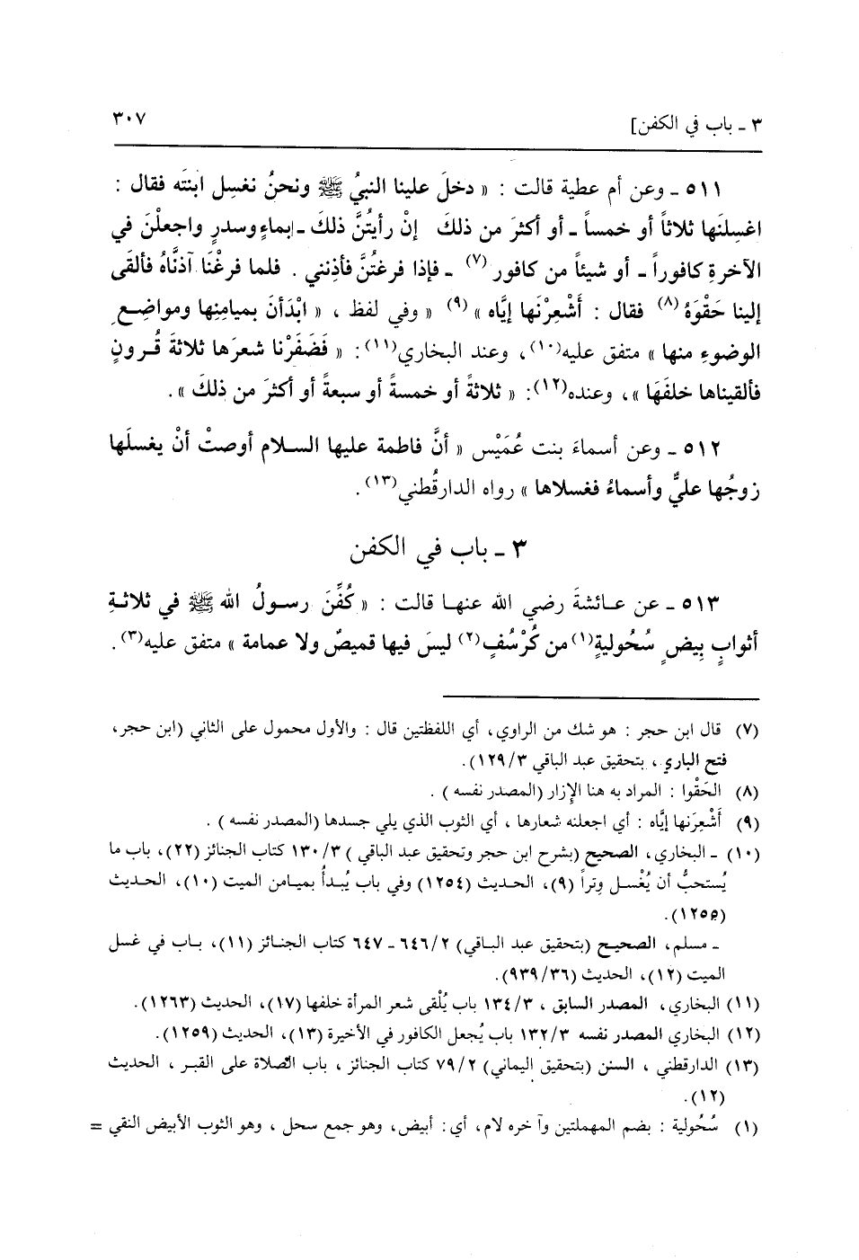513 - عَن عَائِشَة رَضِيَ اللَّهُ عَنْها قَالَت: " كفن رَسُول الله صَلَّى اللَّهُ عَلَيْهِ وَسَلَّم َ فِي ثَلَاثَة أَثوَاب بيض سحُولِيَّة من كُرْسُف لَيْسَ فِيهَا قَمِيص وَلَا عِمَامَة " مُتَّفق عَلَيْهِ.