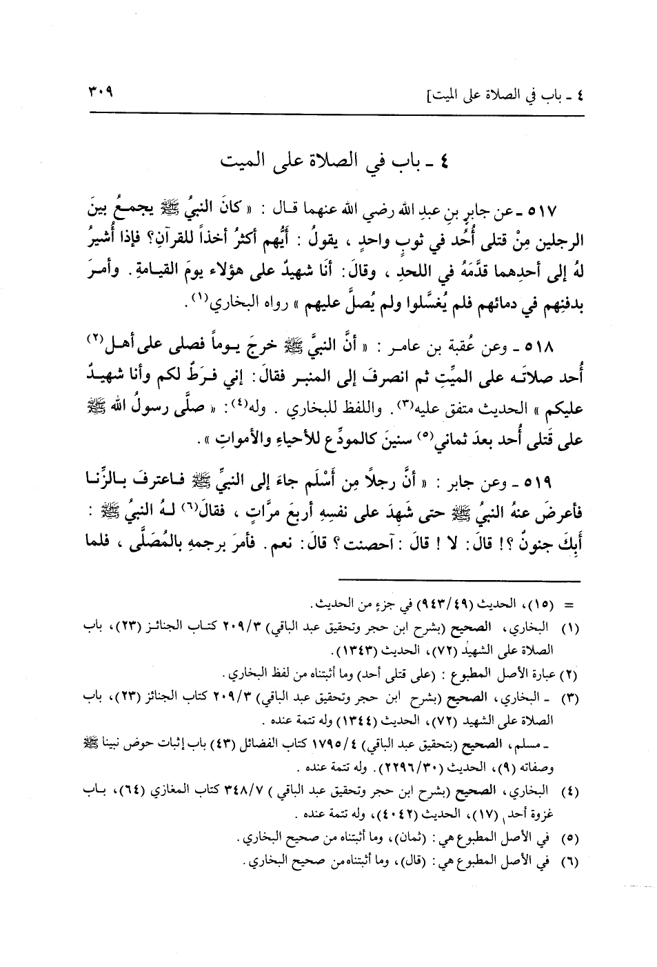 517 - عَن جَابر بن عبد الله رَضِيَ اللَّهُ عَنْهما قَالَ: " كَانَ النَّبِي صَلَّى اللَّهُ عَلَيْهِ وَسَلَّم َ يجمع بَين الرجلَيْن من قَتْلَى أحد فِي ثوب وَاحِد، يَقُول: أَيهمْ أَكثر أخذا لِلْقُرْآنِ؟ فَإِذا أُشير لَهُ إِلَى أَحدهمَا قدمه فِي اللَّحْد، وَقَالَ: أَنا شَهِيد عَلَى هَؤُلَاءِ يَوْم الْقِيَامَة. وَأمر بدفنهم فِي دِمَائِهِمْ فَلم يغسلوا وَلم يصل عَلَيْهِم " رَوَاهُ البُخَارِيّ.