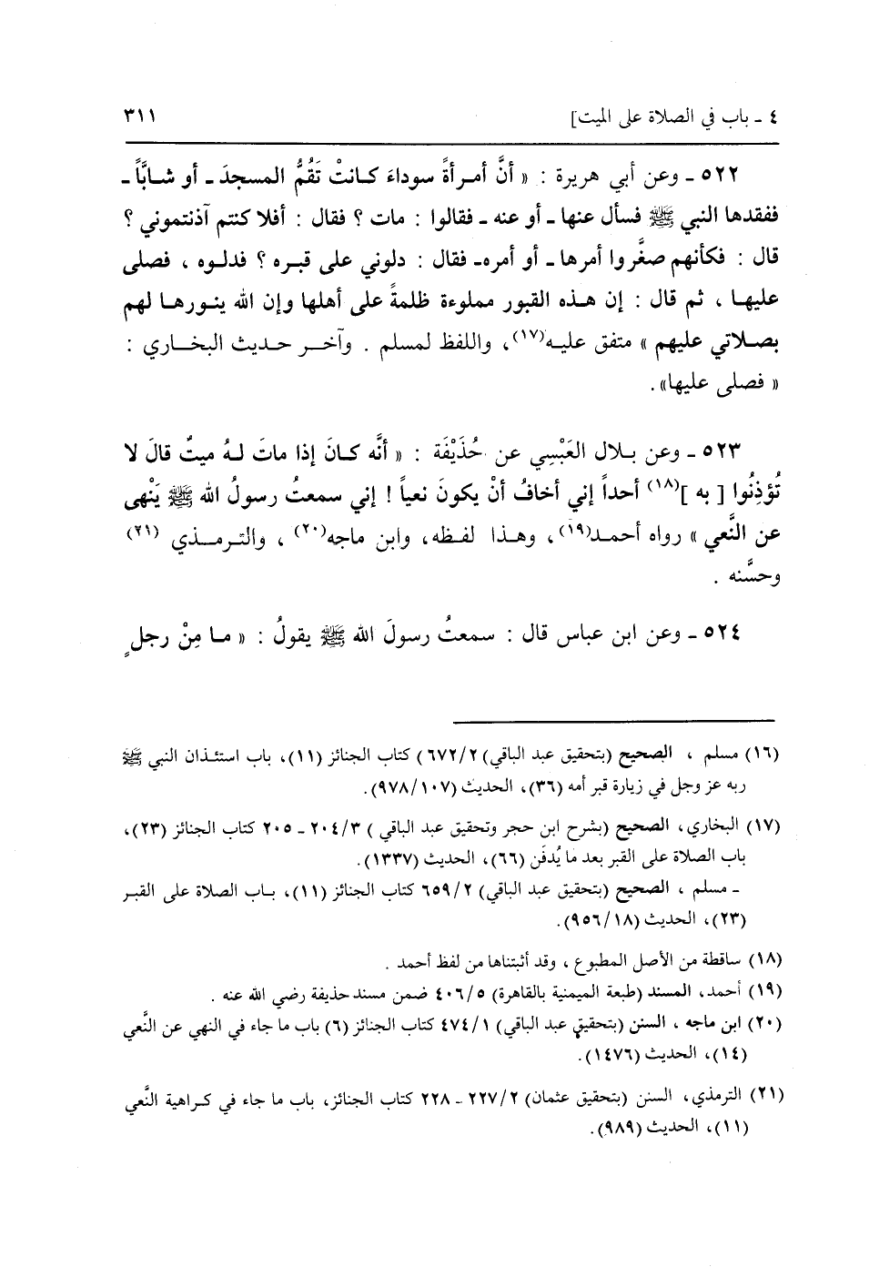 522 - وَعَن أبي هُرَيْرَة: " أَن امْرَأَة سَوْدَاء كَانَت تقمّ الْمَسْجِد - أَو شَابًّا - ففقدها النَّبِي صَلَّى اللَّهُ عَلَيْهِ وَسَلَّم َ فَسَأَلَ عَنْهَا - أَو عَنهُ - فَقَالُوا: مَاتَ؟ فَقَالَ: أَفلا كُنْتُم آذنتموني؟ قَالَ: فكأنهم صغّروا أمرهَا - أَو أمره - فَقَالَ: دلوني عَلَى قَبره؟ فدلوه، فَصَلى عَلَيْهَا، ثمَّ قَالَ: إِن هَذِه الْقُبُور مَمْلُوءَة ظلمَة عَلَى أَهلهَا وَإِن الله ينورها لَهُم بصلاتي عَلَيْهِم " مُتَّفق عَلَيْهِ، وَاللَّفْظ لمُسلم. وَآخر حَدِيث البُخَارِيّ: " فَصَلى عَلَيْهَا ".