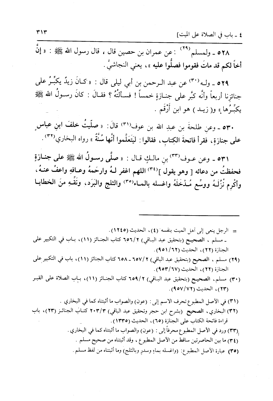 529 - وَله عَن عبد الرَّحْمَن بن أبي لَيْلَى قَالَ: " كَانَ زيد يكبّر عَلَى جنائزنا أَرْبعا وَأَنه كبّر عَلَى جَنَازَة خمْسا! فَسَأَلته؟ فَقَالَ: كَانَ رَسُول الله صَلَّى اللَّهُ عَلَيْهِ وَسَلَّم َ يكبّرها " و (زيد) هُوَ ابْن أَرقم.