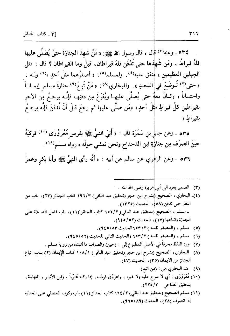 534 - وَعنهُ قَالَ، قَالَ رَسُول الله صَلَّى اللَّهُ عَلَيْهِ وَسَلَّم َ: " من شهد الْجِنَازَة حَتَّى يُصلى عَلَيْهَا فَلهُ قِيرَاط، وَمن شَهِدَهَا حَتَّى تدفن فَلهُ قيراطان، قيل وَمَا القيراطان؟ قَالَ: مثل الجبلين العظيمين " مُتَّفق عَلَيْهِ. وَلمُسلم: " أصغرهما مثل أحد " وَله: " حَتَّى تُوضَع فِي اللَّحْد ". وللبخاري: " من تبع جَنَازَة مُسلم إِيمَانًا واحتساباً، وَكَانَ مَعَه حَتَّى يُصلّى عَلَيْهَا ويفرغ من دَفنهَا فَإِنَّهُ يرجع من الْأجر بقيراطين كل قِيرَاط مثل أحد، وَمن صَلَّى عَلَيْهَا ثمَّ رَجَعَ قبل أَن تدفن فَإِنَّهُ يرجع بقيراط ".