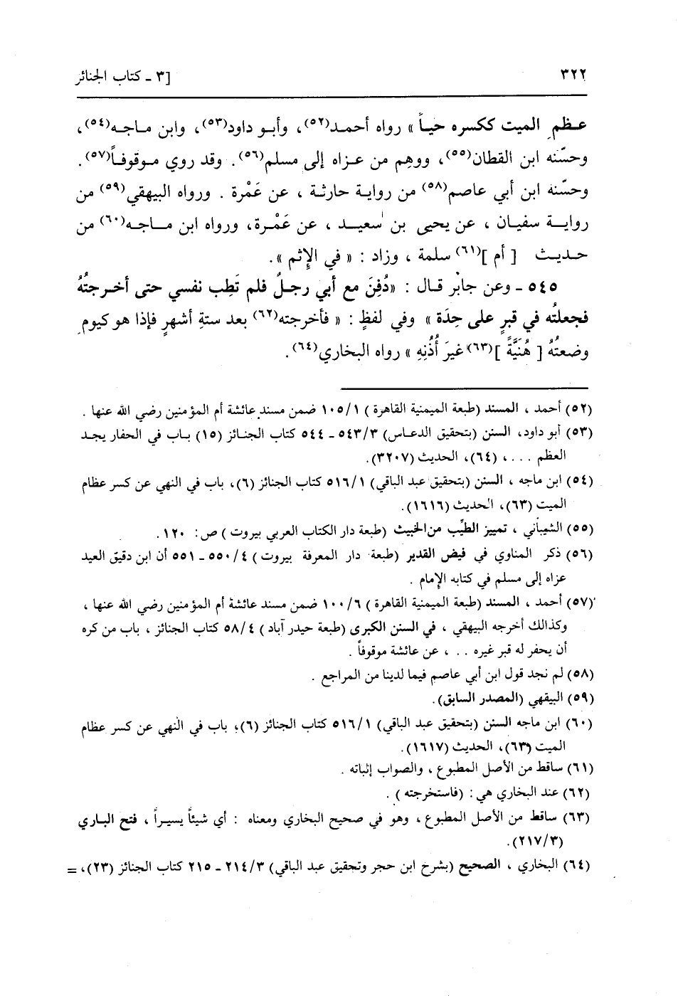 عظم الْمَيِّت ككسره حَيا " رَوَاهُ أَحْمد، وَأَبُو دَاوُد، وَابْن مَاجَه، (وَحسنه ابْن الْقطَّان، وَوهم من عزاهُ إِلَى مُسلم. وَقد رُوِيَ مَوْقُوفا. وَحسنه ابْن أبي عَاصِم) من رِوَايَة حَارِثَة، عَن عمْرَة. وَرَوَاهُ الْبَيْهَقِيّ من رِوَايَة سُفْيَان، عَن يَحْيَى بن سعيد، عَن عمْرَة، وَرَوَاهُ ابْن مَاجَه من حَدِيث [أم] سَلمَة، وَزَاد: " فِي الْإِثْم ".