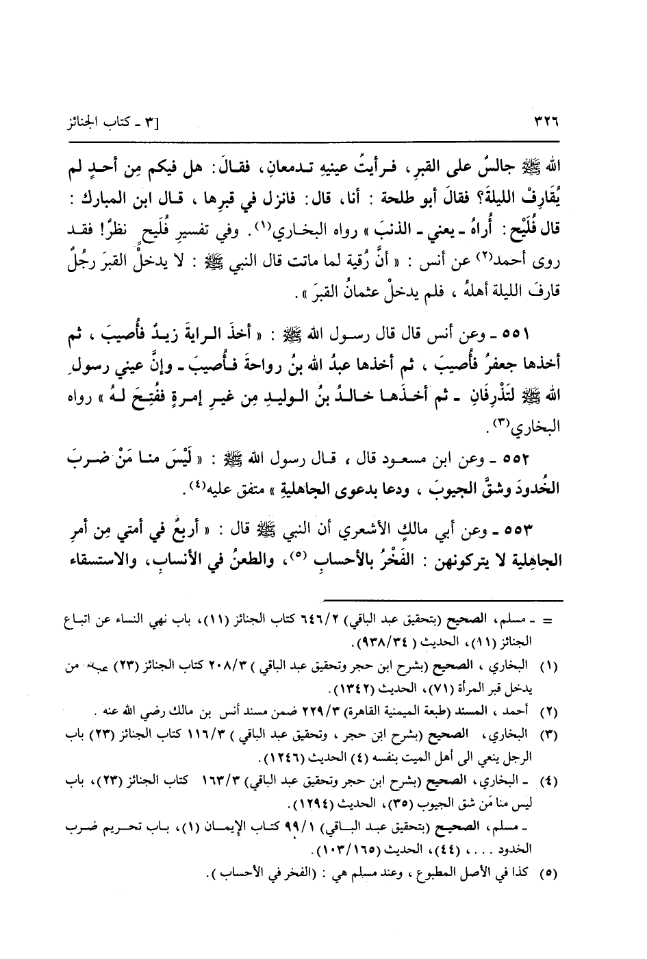 الله صَلَّى اللَّهُ عَلَيْهِ وَسَلَّم َ جَالس عَلَى الْقَبْر، فَرَأَيْت عَيْنَيْهِ تدمعان، فَقَالَ: هَل فِيكُم من أحد لم يقارف اللَّيْلَة؟ فَقَالَ أَبُو طَلْحَة: أَنا، قَالَ: فَانْزِل فِي قبرها، قَالَ ابْن الْمُبَارك: قَالَ فليح: أُراه - يَعْنِي - الذَّنب " رَوَاهُ البُخَارِيّ. وَفِي تَفْسِير فليح نظر! فقد رَوَى أَحْمد عَن أنس: " أَن رقية لما مَاتَت قَالَ النَّبِي صَلَّى اللَّهُ عَلَيْهِ وَسَلَّم َ: لَا يدْخل الْقَبْر رجل قارف اللَّيْلَة أَهله، فَلم يدْخل عُثْمَان الْقَبْر ".