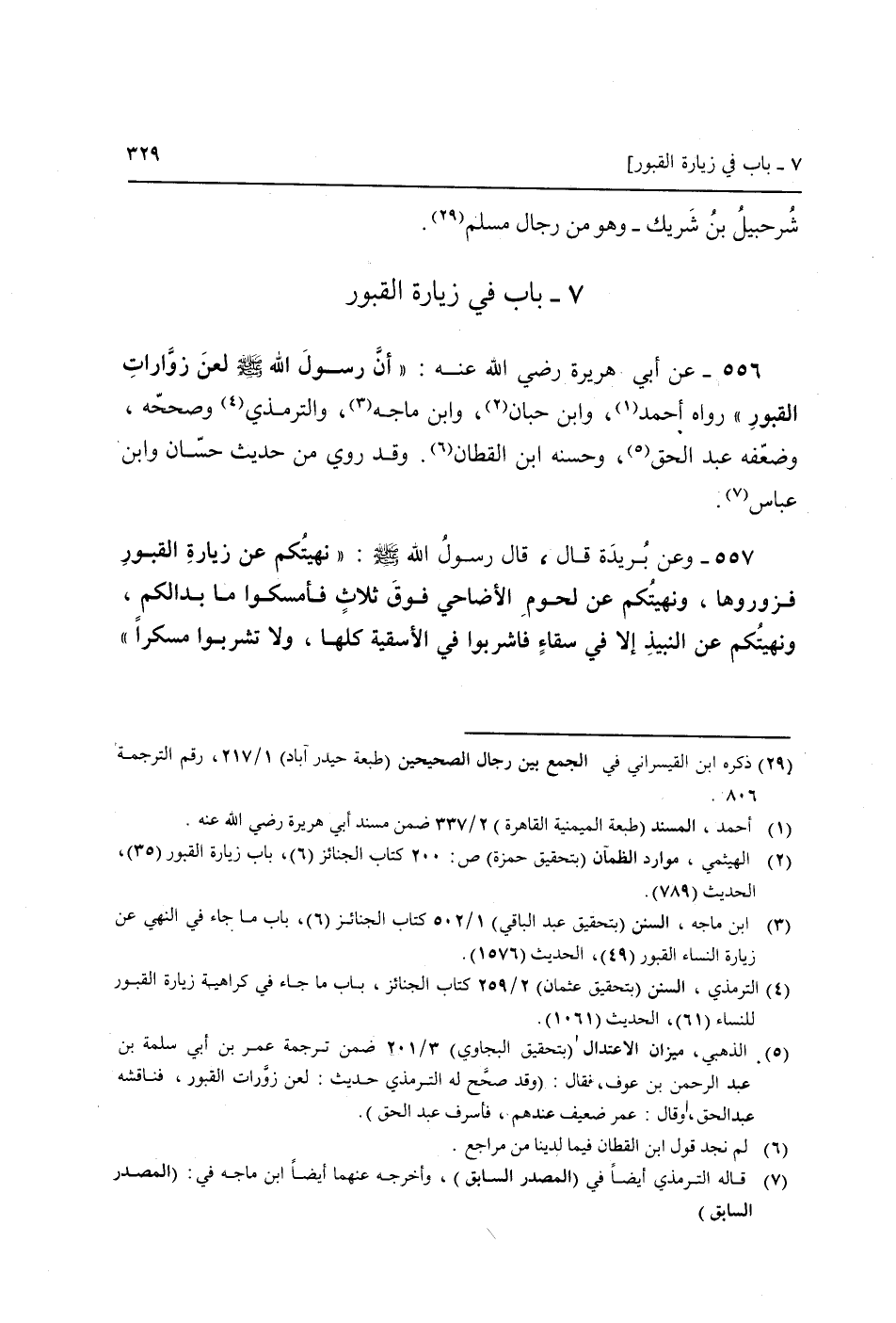 556 - عَن أبي هُرَيْرَة رَضِيَ اللَّهُ عَنْه: " أَن رَسُول الله صَلَّى اللَّهُ عَلَيْهِ وَسَلَّم َ لعن زوّارات الْقُبُور " رَوَاهُ أَحْمد، وَابْن حبَان، وَابْن مَاجَه، (وَالتِّرْمِذِيّ وَصَححهُ، وَضَعفه عبد الْحق، وَحسنه ابْن الْقطَّان. وَقد رُوِيَ من حَدِيث حسان وَابْن عَبَّاس) .