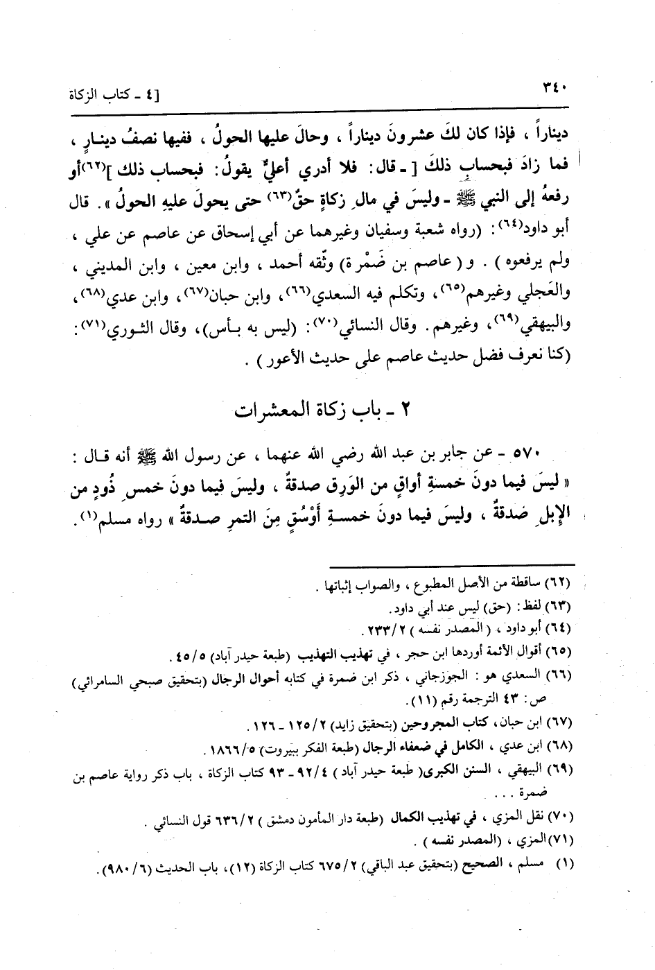 دِينَارا، فَإِذا كَانَ لَك عشرُون دِينَارا، وَحَال عَلَيْهَا الْحول، فَفِيهَا نصف دِينَار، فَمَا زَاد فبحساب ذَلِك [- قَالَ: فَلَا أَدْرِي أعلي يَقُول: فبحساب ذَلِك] أَو رَفعه إِلَى النَّبِي صَلَّى اللَّهُ عَلَيْهِ وَسَلَّم َ - وَلَيْسَ فِي مَال زَكَاة حق حَتَّى يحول عَلَيْهِ الْحول ". قَالَ أَبُو دَاوُد: (رَوَاهُ شُعْبَة وسُفْيَان وَغَيرهمَا عَن أبي إِسْحَاق عَن عَاصِم عَن عَلّي، وَلم يرفعوه) . و (عَاصِم بن ضَمرَة) (وَثَّقَهُ أَحْمد، وَابْن معِين، وَابْن الْمَدِينِيّ، وَالْعجلِي وَغَيرهم، وَتكلم فِيهِ السَّعْدِيّ، وَابْن حبَان، وَابْن عدي، وَالْبَيْهَقِيّ، وَغَيرهم. وَقَالَ النَّسَائِيّ: (لَيْسَ بِهِ بَأْس) ، وَقَالَ الثَّوْريّ: (كُنَّا نَعْرِف فضل حَدِيث عَاصِم عَلَى حَدِيث الْأَعْوَر)) .