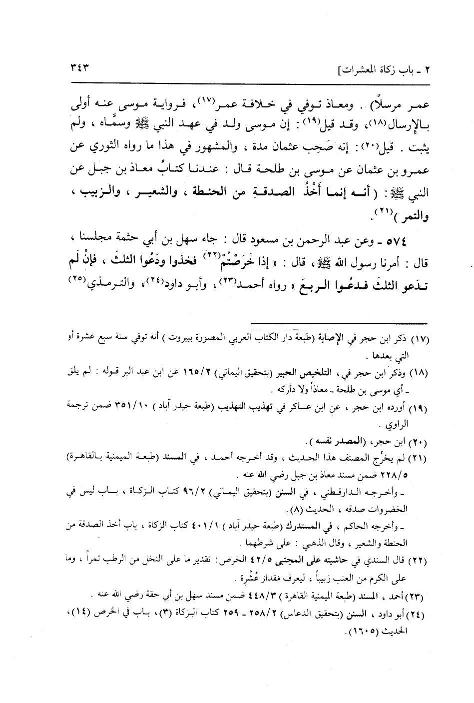 574 - وَعَن عبد الرَّحْمَن بن مَسْعُود قَالَ: جَاءَ سهل بن أبي حثْمَة مَجْلِسنَا، قَالَ: أمرنَا رَسُول الله صَلَّى اللَّهُ عَلَيْهِ وَسَلَّم َ، قَالَ: إِذا خرصتم فَخُذُوا ودعوا الثُّلُث، فَإِن لم تَدْعُو الثُّلُث فدعوا الرّبع " رَوَاهُ أَحْمد، وَأَبُو دَاوُد،