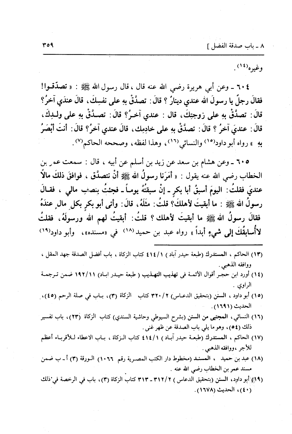 604 - وَعَن أبي هُرَيْرَة رَضِيَ اللَّهُ عَنْه قَالَ، قَالَ رَسُول الله صَلَّى اللَّهُ عَلَيْهِ وَسَلَّم َ: " تصدقوا! فَقَالَ رجل يَا رَسُول الله عِنْدِي دِينَار؟ قَالَ: تصدق بِهِ عَلَى نَفسك، قَالَ عِنْدِي آخر؟ قَالَ: تصدق بِهِ عَلَى زَوجتك، قَالَ: عِنْدِي آخر؟ قَالَ: تصدق بِهِ عَلَى ولدك، قَالَ: عِنْدِي آخر؟ قَالَ: تصدق بِهِ عَلَى خادمك، قَالَ عِنْدِي آخر؟ قَالَ: أَنْت أبْصر بِهِ " رَوَاهُ أَبُو دَاوُد وَالنَّسَائِيّ، وَهَذَا لَفظه، (وَصَححهُ الْحَاكِم) .