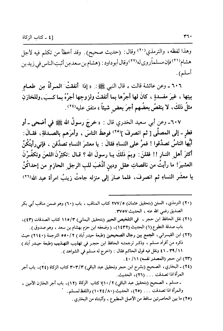 607 - وَعَن أبي سعيد الْخُدْرِيّ قَالَ: " خرج رَسُول الله صَلَّى اللَّهُ عَلَيْهِ وَسَلَّم َ فِي أَضْحَى - أَو فطر - إِلَى الْمُصَلى [ثمَّ انْصَرف] فوعظ النَّاس، وَأمرهمْ بِالصَّدَقَةِ، فَقَالَ: أَيهَا النَّاس تصدقوا! فَمر عَلَى النِّسَاء فَقَالَ: يَا معشر النِّسَاء تصدقن، فَإِنِّي رأيتكن أَكثر أهل النَّار! ! فَقُلْنَ: وَبِمَ ذَلِك يَا رَسُول الله؟ قَالَ: تكثرن اللَّعْن وتكفرن العشير! مَا رَأَيْت من ناقصات عقل وَدين أذهب للب الرجل الحازم من إحداكن يَا معشر النِّسَاء ثمَّ انْصَرف، فَلَمَّا صَار إِلَى منزله جَاءَت زَيْنَب امْرَأَة عبد الله