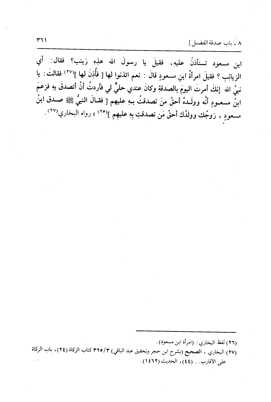 ابْن مَسْعُود تستأذن عَلَيْهِ، فَقيل يَا رَسُول الله هَذِه زَيْنَب؟ فَقَالَ: أَي الزيانب؟ فَقيل امْرَأَة ابْن مَسْعُود قَالَ: نعم ائذنوا لَهَا [فأُذن لَهَا] فَقَالَت: يَا نَبِي الله إِنَّك أمرت الْيَوْم بِالصَّدَقَةِ وَكَانَ عِنْدِي حلي لي فَأَرَدْت أَن أَتصدق بِهِ فَزعم ابْن مَسْعُود أَنه وَولده أَحَق من تَصَدَّقت بِهِ عَلَيْهِم [فَقَالَ النَّبِي صَلَّى اللَّهُ عَلَيْهِ وَسَلَّم َ صدق ابْن مَسْعُود، زَوجك وولدك أَحَق من تَصَدَّقت بِهِ عَلَيْهِم] " رَوَاهُ البُخَارِيّ.