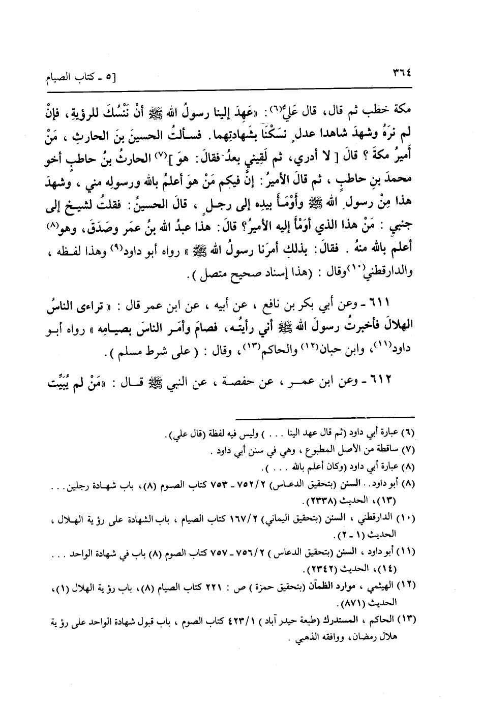 مَكَّة خطب ثمَّ قَالَ، قَالَ عَلّي: " عهد إِلَيْنَا رَسُول الله صَلَّى اللَّهُ عَلَيْهِ وَسَلَّم َ أَن ننسك للرؤية، فَإِن لم نره وَشهد شَاهدا عدل نسكنا بِشَهَادَتِهِمَا. فَسَأَلت الْحُسَيْن بن الْحَارِث، من أَمِير مَكَّة؟ قَالَ [لَا أَدْرِي، ثمَّ لَقِيَنِي بعد فَقَالَ: هُوَ] الْحَارِث بن حَاطِب أَخُو مُحَمَّد بن حَاطِب، ثمَّ قَالَ الْأَمِير: إِن فِيكُم من هُوَ أعلم بِاللَّه وَرَسُوله مني، وَشهد هَذَا من رَسُول الله صَلَّى اللَّهُ عَلَيْهِ وَسَلَّم َ وَأَوْمَأَ بِيَدِهِ إِلَى رجل، قَالَ الْحُسَيْن: فَقلت لشيخ إِلَى جَنْبي: من هَذَا الَّذِي أَوْمَأ إِلَيْهِ الْأَمِير؟ قَالَ: هَذَا عبد الله بن عمر وَصدق، وَهُوَ أعلم بِاللَّه مِنْهُ. فَقَالَ: بذلك أمرنَا رَسُول الله صَلَّى اللَّهُ عَلَيْهِ وَسَلَّم َ " رَوَاهُ أَبُو دَاوُد وَهَذَا لَفظه، وَالدَّارَقُطْنِيّ وَقَالَ: (هَذَا إِسْنَاد صَحِيح مُتَّصِل) .