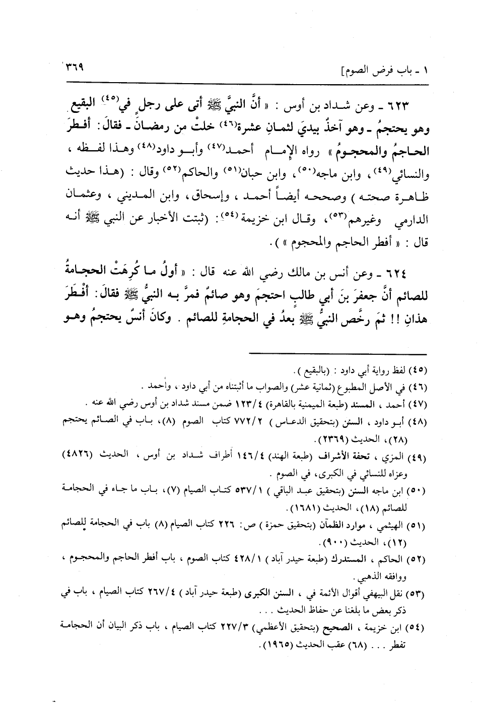 623 - وَعَن شَدَّاد بن أَوْس: " أَن النَّبِي صَلَّى اللَّهُ عَلَيْهِ وَسَلَّم َ أَتَى عَلَى رجل فِي البقيع وَهُوَ يحتجم - وَهُوَ آخذ بيَدي لثمان عشرَة خلت من رَمَضَان - فَقَالَ: أفطر الحاجم والمحجوم " رَوَاهُ الإِمَام أَحْمد وَأَبُو دَاوُد وَهَذَا لَفظه، وَالنَّسَائِيّ، وَابْن مَاجَه، وَابْن حبَان وَالْحَاكِم (وَقَالَ: (هَذَا حَدِيث ظَاهِرَة صِحَّته) وَصَححهُ أَيْضا أَحْمد، وَإِسْحَاق، وَابْن الْمَدِينِيّ، وَعُثْمَان الدَّارمِيّ وَغَيرهم) ، وَقَالَ ابْن خُزَيْمَة: (ثبتَتْ الْأَخْبَار عَن النَّبِي صَلَّى اللَّهُ عَلَيْهِ وَسَلَّم َ أَنه قَالَ: " أفطر الحاجم والمحجوم ")) .