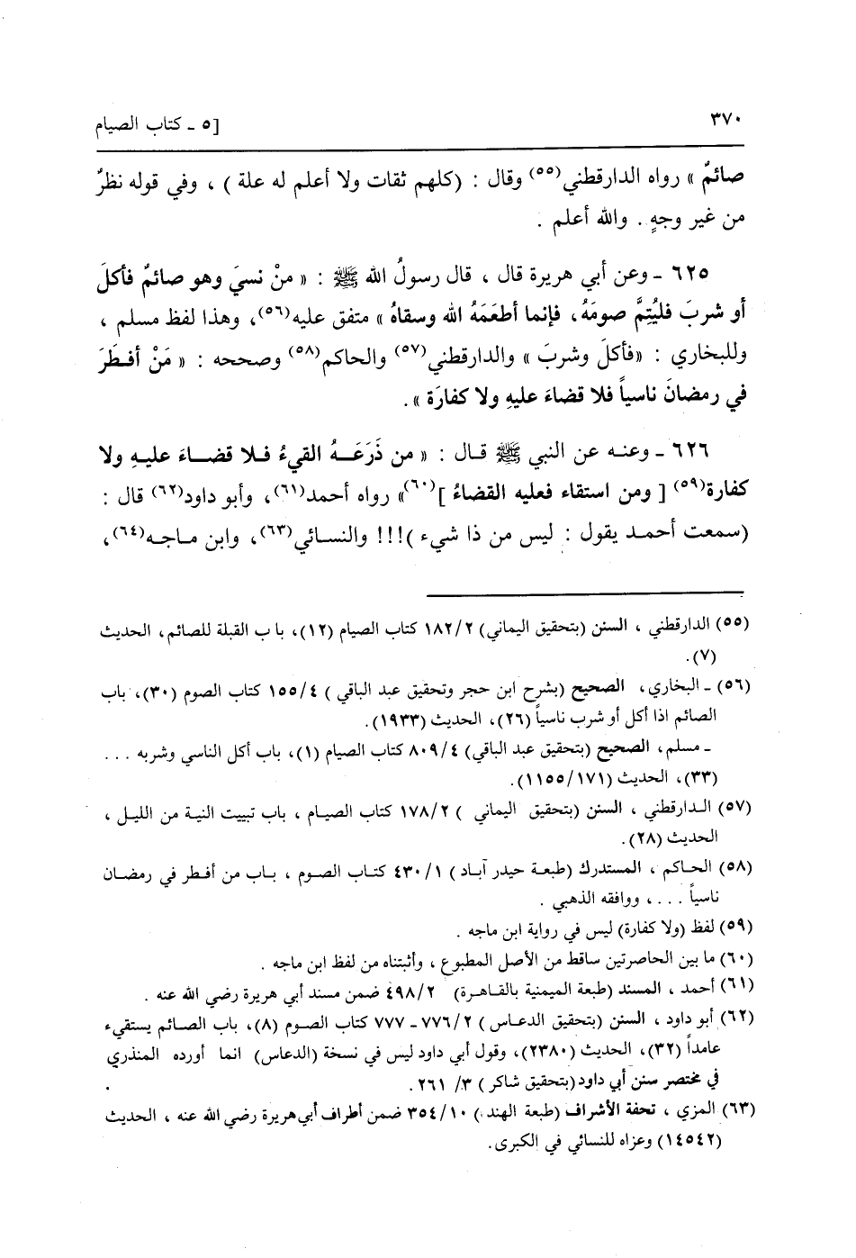 625 - وَعَن أبي هُرَيْرَة قَالَ، قَالَ رَسُول الله صَلَّى اللَّهُ عَلَيْهِ وَسَلَّم َ: " من نسي وَهُوَ صَائِم فَأكل أَو شرب فليتم صَوْمه، فَإِنَّمَا أطْعمهُ الله وسقاه " مُتَّفق عَلَيْهِ، وَهَذَا لفظ مُسلم، وللبخاري: " فَأكل وَشرب " وَالدَّارَقُطْنِيّ (وَالْحَاكِم وَصَححهُ) : " من أفطر فِي رَمَضَان نَاسِيا فَلَا قَضَاء عَلَيْهِ وَلَا كَفَّارَة ".
