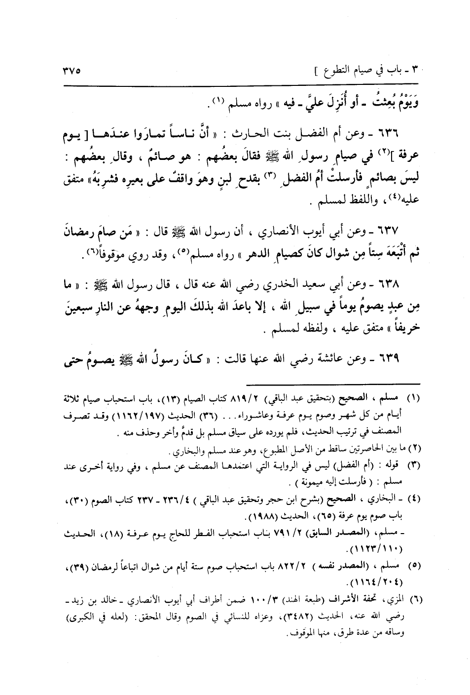 636 - وَعَن أم الْفضل بنت الْحَارِث: " أَن نَاسا تماروا عِنْدهَا [يَوْم عَرَفَة] فِي صِيَام رَسُول الله صَلَّى اللَّهُ عَلَيْهِ وَسَلَّم َ فَقَالَ بَعضهم: هُوَ صَائِم، وَقَالَ بَعضهم: لَيْسَ بصائم فَأرْسلت أم الْفضل بقدح لبن وَهُوَ وَاقِف عَلَى بعيره فشربه " مُتَّفق عَلَيْهِ، وَاللَّفْظ لمُسلم.