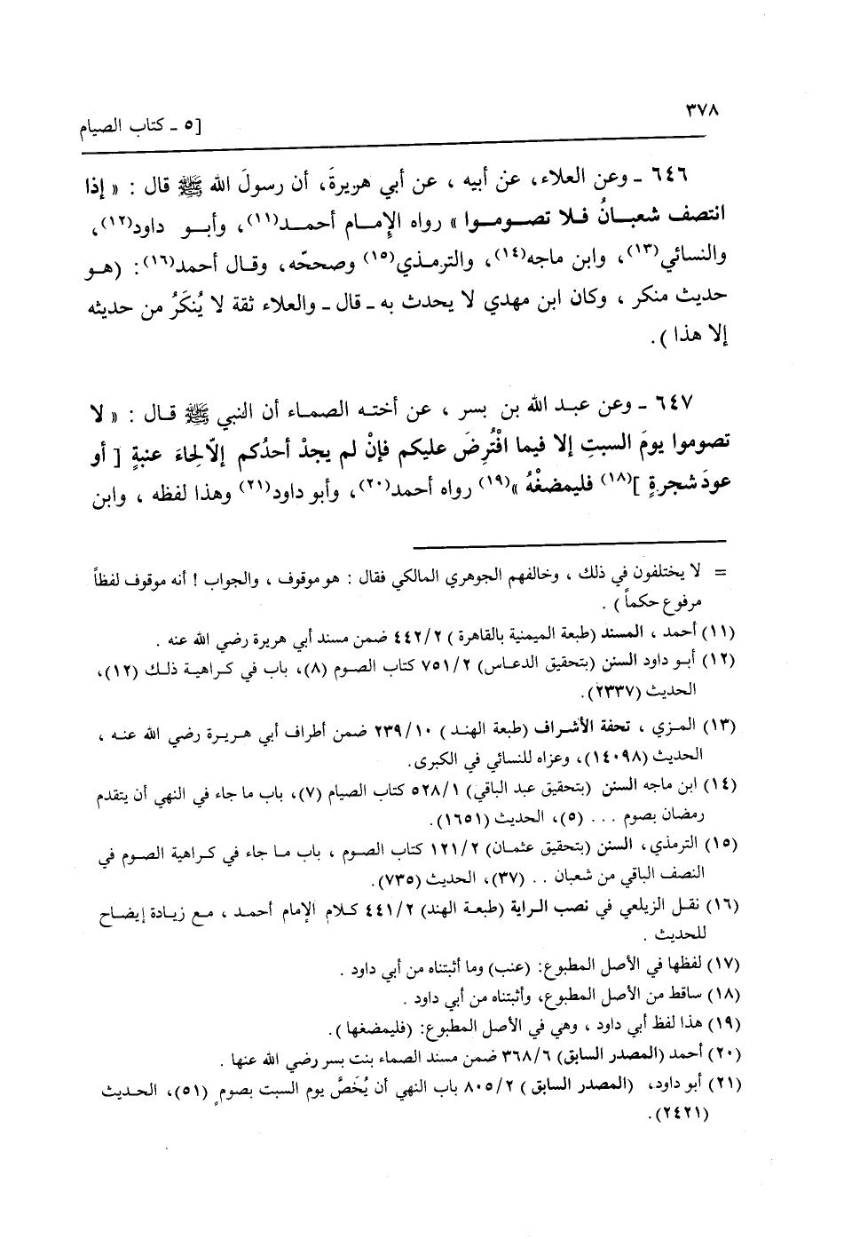 646 - وَعَن الْعَلَاء، عَن أَبِيه، عَن أبي هُرَيْرَة، أَن رَسُول الله صَلَّى اللَّهُ عَلَيْهِ وَسَلَّم َ قَالَ: " إِذا انتصف شعْبَان فَلَا تَصُومُوا " رَوَاهُ الإِمَام أَحْمد، وَأَبُو دَاوُد، وَالنَّسَائِيّ، وَابْن مَاجَه، وَالتِّرْمِذِيّ (وَصَححهُ، وَقَالَ أَحْمد: (هُوَ حَدِيث مُنكر، وَكَانَ ابْن مهْدي لَا يحدث بِهِ - قَالَ - والْعَلَاء ثِقَة لَا يُنكر من حَدِيثه إِلَّا هَذَا)) .