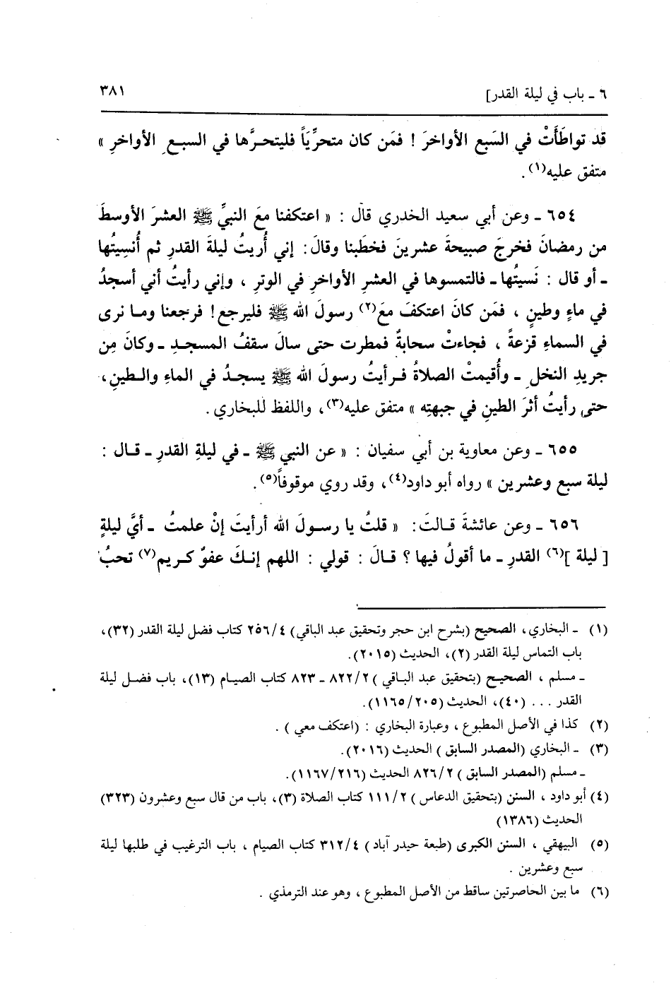 654 - وَعَن أبي سعيد الْخُدْرِيّ قَالَ: " اعتكفنا مَعَ النَّبِي صَلَّى اللَّهُ عَلَيْهِ وَسَلَّم َ الْعشْر الْأَوْسَط من رَمَضَان فَخرج صَبِيحَة عشْرين فَخَطَبنَا وَقَالَ: إِنِّي رَأَيْت لَيْلَة الْقدر ثمَّ أنسيتها - أَو قَالَ: نسيتهَا فالتمسوها فِي الْعشْر الْأَوَاخِر فِي الْوتر، وَإِنِّي رَأَيْت أَنِّي أَسجد فِي مَاء وطين، فَمن كَانَ اعْتكف مَعَ رَسُول الله صَلَّى اللَّهُ عَلَيْهِ وَسَلَّم َ فَليرْجع! فرجعنا وَمَا نرَى فِي السَّمَاء قزعة، فَجَاءَت سَحَابَة فمطرت حَتَّى سَالَ سقف الْمَسْجِد - وَكَانَ من جريد النّخل - وأقيمت الصَّلَاة فَرَأَيْت رَسُول الله صَلَّى اللَّهُ عَلَيْهِ وَسَلَّم َ يسْجد فِي المَاء والطين، حَتَّى رَأَيْت أثر الطين فِي جَبهته " مُتَّفق عَلَيْهِ وَاللَّفْظ للْبُخَارِيّ.