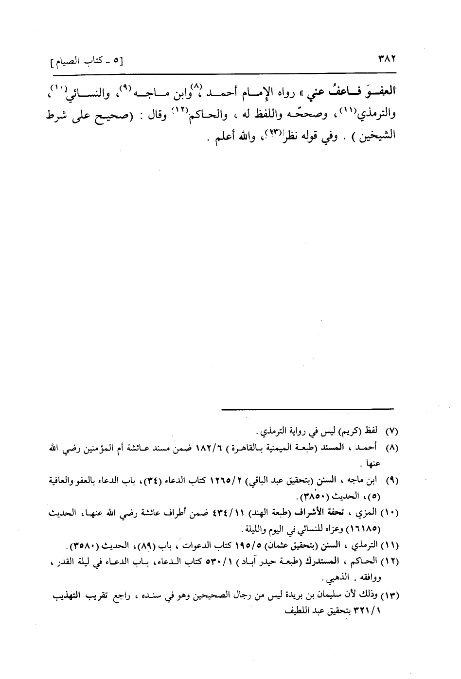الْعَفو فَاعْفُ عني " رَوَاهُ الإِمَام أَحْمد، وَابْن ماجة، وَالنَّسَائِيّ، (وَالتِّرْمِذِيّ، وَصَححهُ وَاللَّفْظ لَهُ، وَالْحَاكِم وَقَالَ: (صَحِيح عَلَى شَرط الشَّيْخَيْنِ) . وَفِي قَوْله نظر) ، وَالله أعلم.