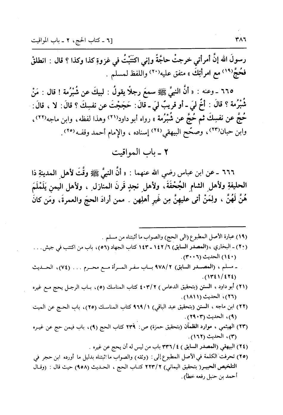 666 - عَن ابْن عَبَّاس رَضِيَ اللَّهُ عَنْهما: " أَن النَّبِي صَلَّى اللَّهُ عَلَيْهِ وَسَلَّم َ وَقت لأهل الْمَدِينَة ذَا الحليفة وَلأَهل الشَّام الْجحْفَة، وَلأَهل نجد قرن الْمنَازل، وَلأَهل الْيمن يَلَمْلَم هن لَهُنَّ، وَلمن أَتَى عَلَيْهِنَّ من غير أهلهن. مِمَّن أَرَادَ الْحَج وَالْعمْرَة، وَمن كَانَ