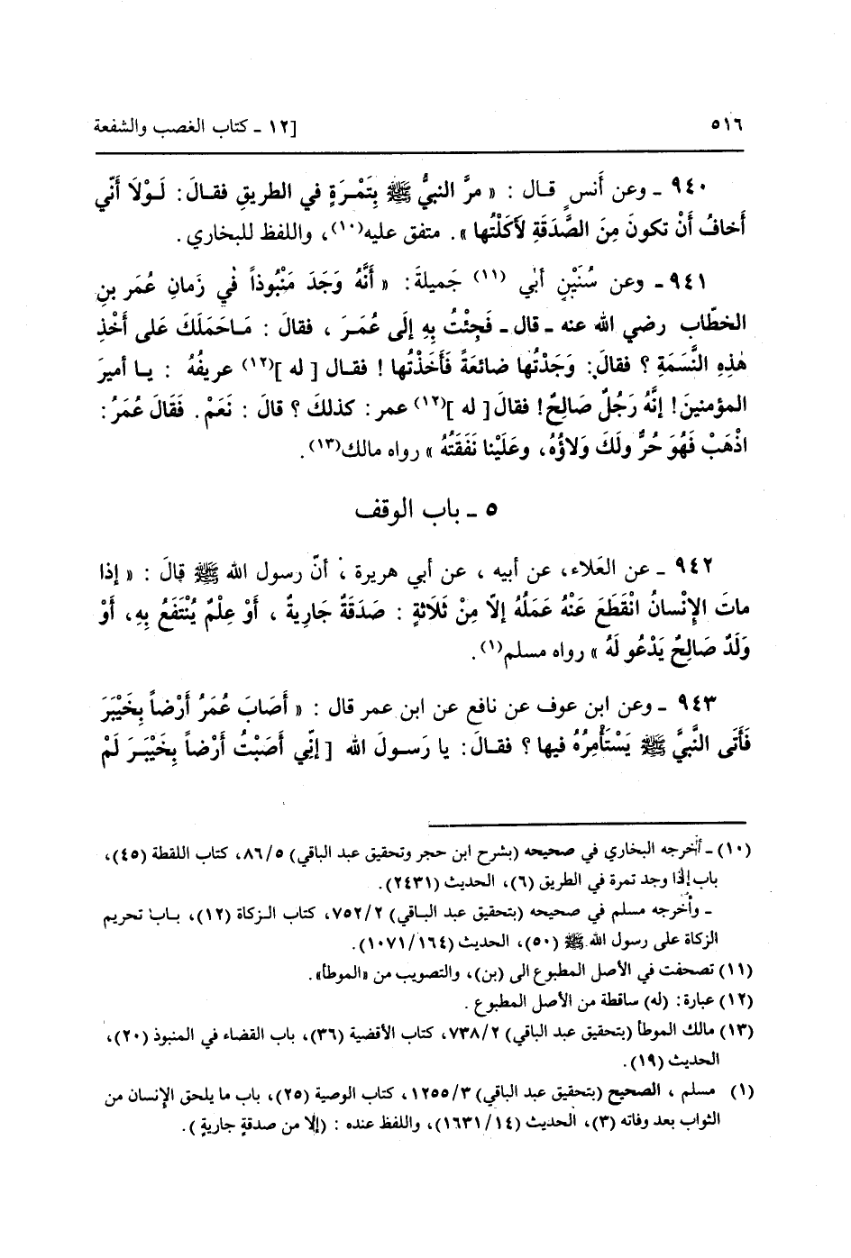 944 - عَن النُّعْمَان بن بشير أَنه قَالَ: " إِن أَبَاهُ أَتَى رَسُول الله صَلَّى اللَّهُ عَلَيْهِ وَسَلَّم َ فَقَالَ: إِنِّي نحلت ابْني هَذَا غُلَاما كَانَ لي؟ فَقَالَ رَسُول الله صَلَّى اللَّهُ عَلَيْهِ وَسَلَّم َ: أكُلّ ولدك نحلته مثل هَذَا؟ فَقَالَ: لَا. فَقَالَ رَسُول الله صَلَّى اللَّهُ عَلَيْهِ وَسَلَّم َ: فارجعه ". وَفِي لفظ، قَالَ: " تصدق عليّ أبي بِبَعْض مَاله، فَقَالَت أُمِّي عمْرَة بنت رَوَاحَة: لَا أَرْضَى حَتَّى تشهد رَسُول الله صَلَّى اللَّهُ عَلَيْهِ وَسَلَّم َ! فَانْطَلق أبي إِلَى رَسُول الله صَلَّى اللَّهُ عَلَيْهِ وَسَلَّم َ ليشهده عَلَى صدقتي، فَقَالَ لَهُ رَسُول الله صَلَّى اللَّهُ عَلَيْهِ وَسَلَّم َ: أفعلت هَذَا بولدك كلهم؟ قَالَ: لَا. قَالَ: اتَّقوا الله واعدلوا فِي أَوْلَادكُم! فَرجع أبي فَرد تِلْكَ الصَّدَقَة " مُتَّفق عَلَيْهِ، وَاللَّفْظ لمُسلم، وَفِي لفظ لَهُ " فَقَالَ أكُلّ بنيك نحلته مثل مَا نحلت النُّعْمَان؟ قَالَ، قَالَ: لَا، قَالَ: فَأشْهد عَلَى هَذَا غَيْرِي! ثمَّ قَالَ: أَيَسُرُّك أَنهم يكونُونَ إِلَيْك فِي الْبر سَوَاء؟ قَالَ: بلَى، قَالَ: فَلَا إِذا ".