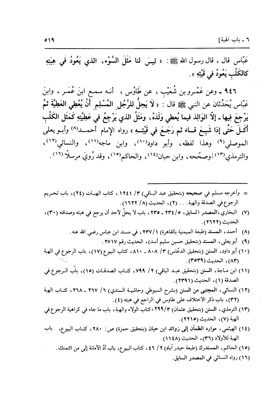 953 - وَعَن زيد بن أسلم عَن أَبِيه أَن عمر بن الْخطاب قَالَ: " حملت عَلَى فرس عَتيق فِي سَبِيل الله فأضاعه صَاحبه، فَظَنَنْت أَنه بَائِعه برخص، فَسَأَلت رَسُول الله صَلَّى اللَّهُ عَلَيْهِ وَسَلَّم َ عَن ذَلِك؟ فَقَالَ: لَا تبتعه (وَإِن أعطاكه بدرهم) ، وَلَا تعد فِي صدقتك! فَإِن الْعَائِد فِي هِبته كَالْكَلْبِ يعود فِي قيئه " مُتَّفق عَلَيْهِ، وَاللَّفْظ لمُسلم.